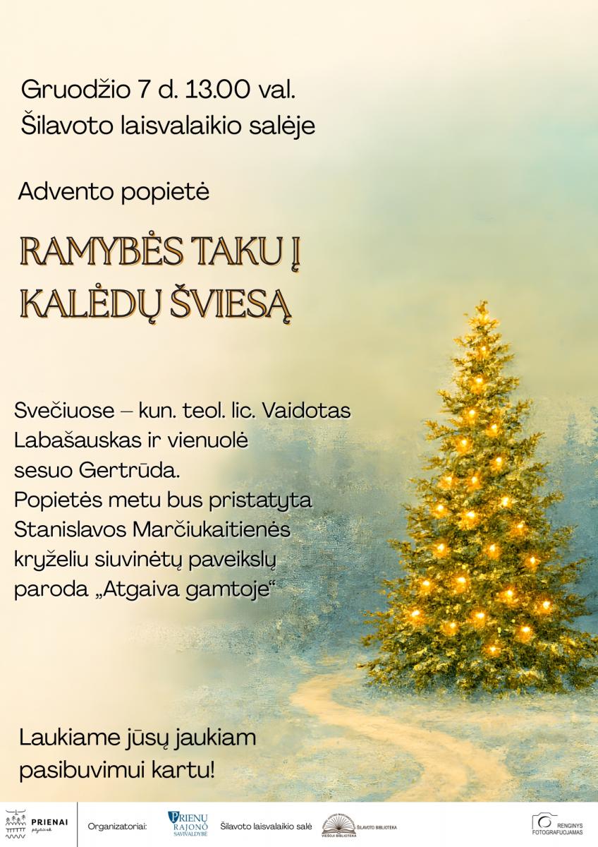 Gruodžio 7 d. 13.00 val. Šilavoto laisvalaikio salėje – Advento popietė „Ramybės taku į Kalėdų šviesą“. Svečiuosis kun. teol. lic. Vaidotas Labašauskas ir vienuolė sesuo Gertrūda. Popietės metu bus pristatyta Stanislavos Marčiukaitienės kryželiu siuvinėtų paveikslų paroda „Atgaiva gamtoje“.