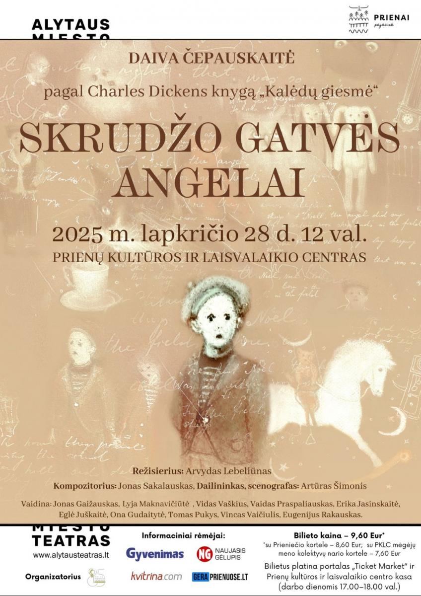 Lapkričio 28 d. 12.00 val. Prienų kultūros ir laisvalaikio centre – Alytaus miesto teatro spektaklis vaikams „Skrudžo gatvės angelai“. Pagal Charles Dickens knygą „Kalėdų giesmė“. Trukmė 1 val. 10 min.