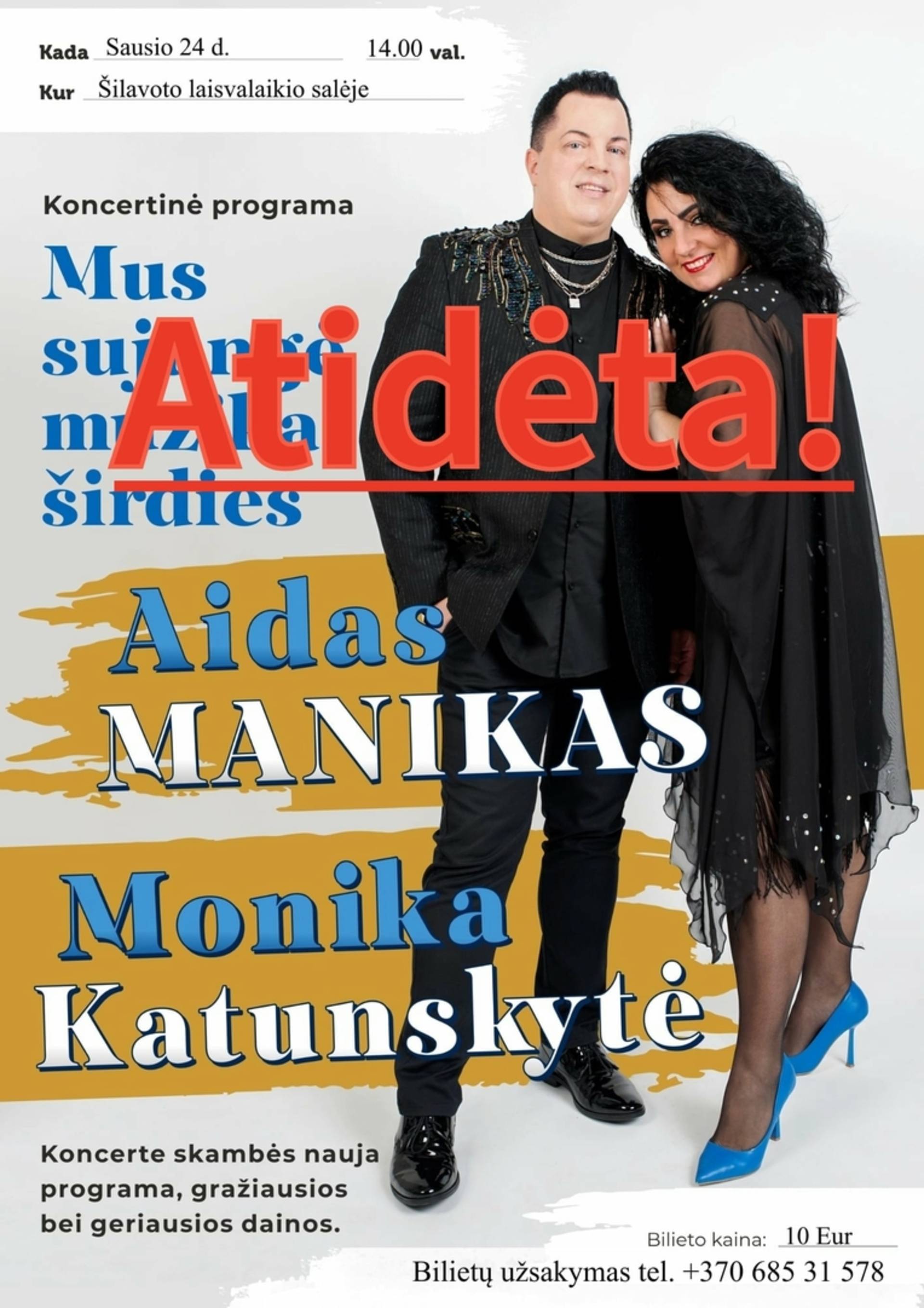Dėmesio. Sausio 24 d. Šilavoto laisvalaikio salėje planuotas atlikėjų Aido Maniko ir Monikos Katunskytės koncertas „Mus sujungė muzika širdies“ – nukeliamas į kovo 14 d. 16.00 val. Maloniai lauksime visų. Atsiprašome už nepatogumus.