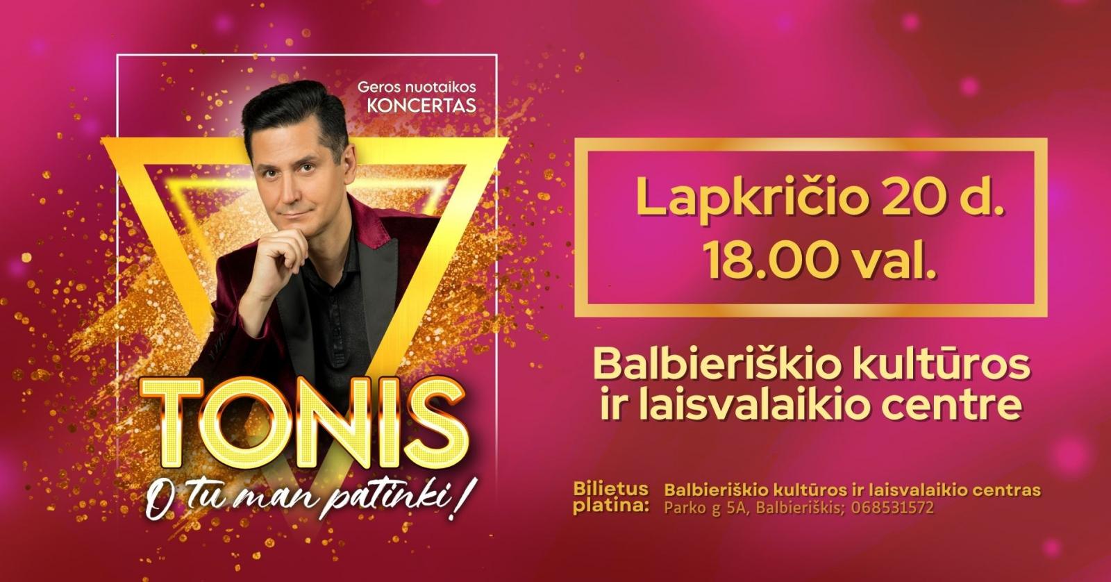 Lapkričio 20 d. 18.00 val. Balbieriškio kultūros ir laisvalaikio centre – atlikėjo Tonio geros nuotaikos koncertas „O tu man patinki!“. Išgirsite pačias populiariausias ir klausytojų pamėgtas dainas „O jei nemyli ir nereik“, „Paskutinis bučinys“, „Per vėlu nebūna“ ir kitas.