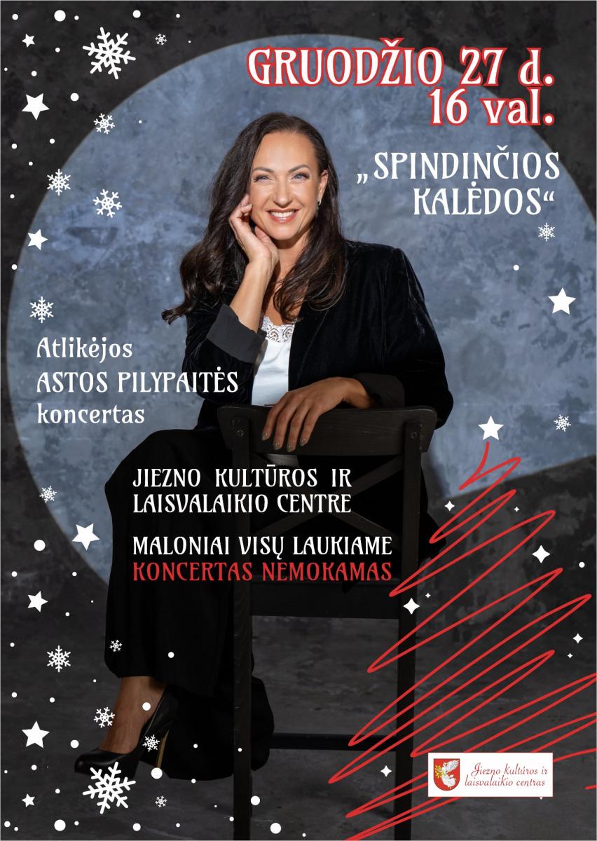 Gruodžio 27 d. 16.00 val. Jiezno kultūros ir laisvalaikio centre – atlikėjos Astos Pilypaitės koncertas „Spindinčios Kalėdos“. Pasitikime Naujus metus su gera nuotaika. Renginys nemokamas, maloniai visų laukiame.