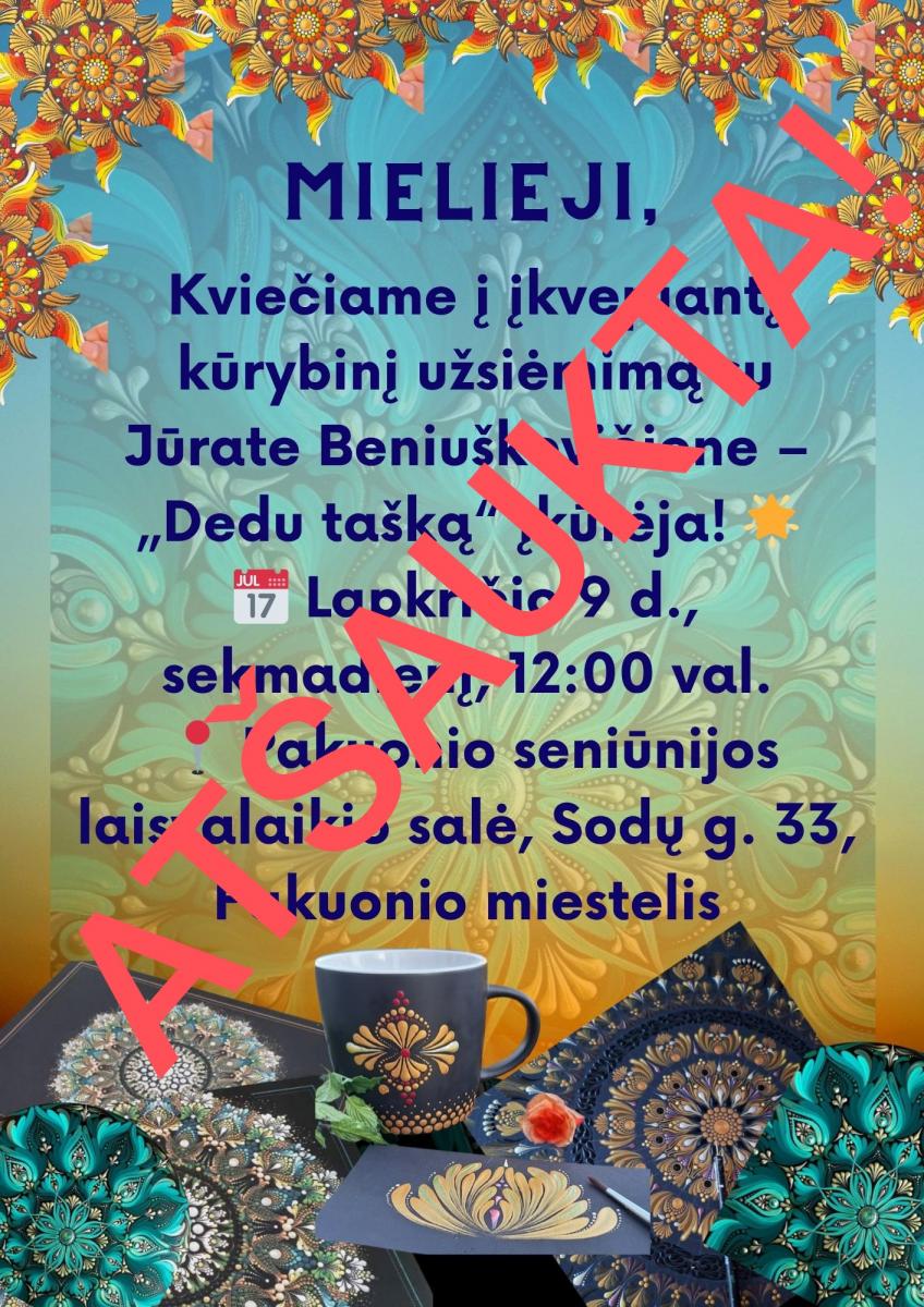 Dėmesio. Nesusirinkus pakankamam dalyvių skaičiui, atšaukiamas lapkričio 9 d. Pakuonio seniūnijos laisvalaikio salėje planuotas kūrybinis užsiėmimas su studijos „Dedu tašką“ įkūrėja Jūrate Beniuškevičiene.