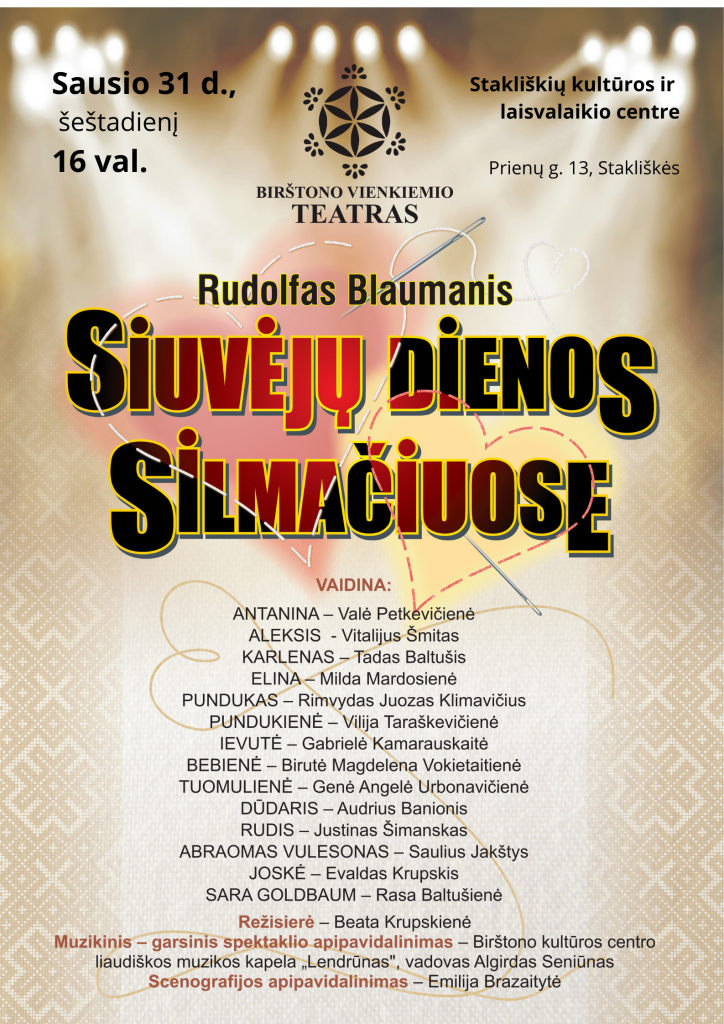 Sausio 31 d. 16.00 val. Stakliškių kultūros ir laisvalaikio centre – Birštono vienkiemio teatro spektaklis „Siuvėjų dienos Silmačiuose“. Režisierė Beata Krupskienė. Įėjimas nemokamas.