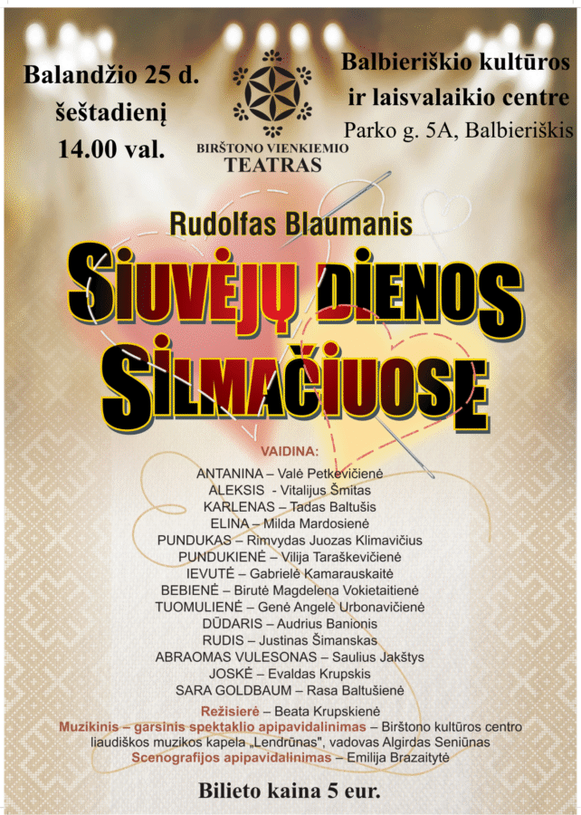 Balandžio 25 d. 14.00 val. Balbieriškio kultūros ir laisvalaikio centre – Birštono vienkiemio teatro spektaklis „Siuvėjų dienos Silmačiuose” (R. Blaumanis). Režisierė Beata Krupskienė. Bilieto kaina – 5 Eur.