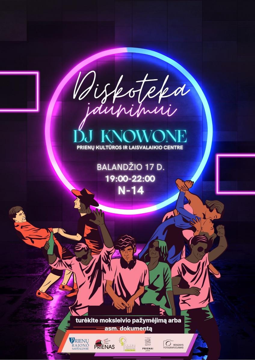 Balandžio 17 d. 19.00 val. Prienų kultūros ir laisvalaikio centre – diskoteka jaunimui su DJ Knowone ir gera muzika. N-14. Turėti moksleivio pažymėjimą arba amžių patvirtinantį dokumentą.