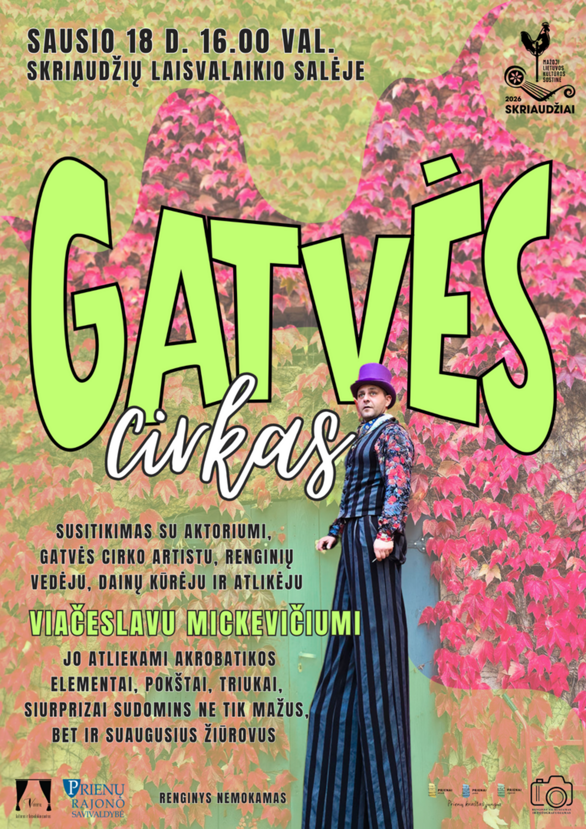 Sausio 18 d. 16.00 val. Skriaudžių laisvalaikio salėje – Gatvės cirkas. Susitikimas su aktoriumi, gatvės cirko artistu, renginių vedėju, dainų kūrėju ir atlikėju Viačeslavu Mickevičiumi. Jo atliekami akrobatikos elementai, triukai, pokštai ir siurprizai sudomins ne tik mažus, bet ir suaugusius žiūrovus. Renginys nemokamas.