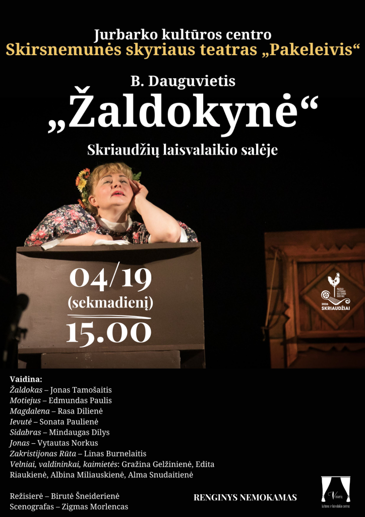 Balandžio 19 d. 15.00 val. Skriaudžių laisvalaikio salėje – Jurbarko kultūros centro Skirsnemunės skyriaus teatro „Pakeleivis“ spektaklis „Žaldokynė“ (B. Dauguvietis). Režisierė Birutė Šneiderienė. Renginys nemokamas. „Skriaudžiai – Mažoji Lietuvos kultūros sostinė 2026“.