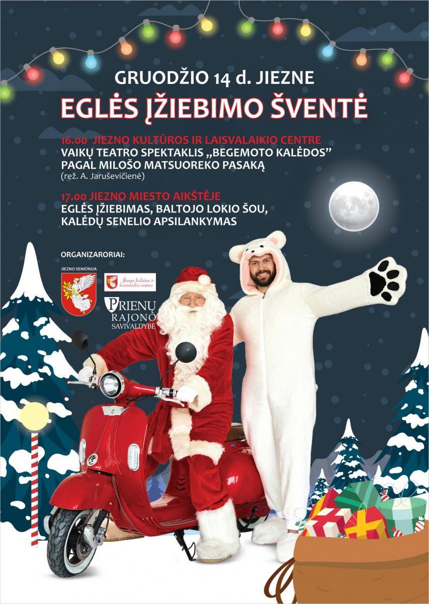 17.00 val. Jiezno miesto aikštėje – Kalėdų eglės įžiebimas. Baltojo lokio šou, susitikimas su Kalėdų seneliu.