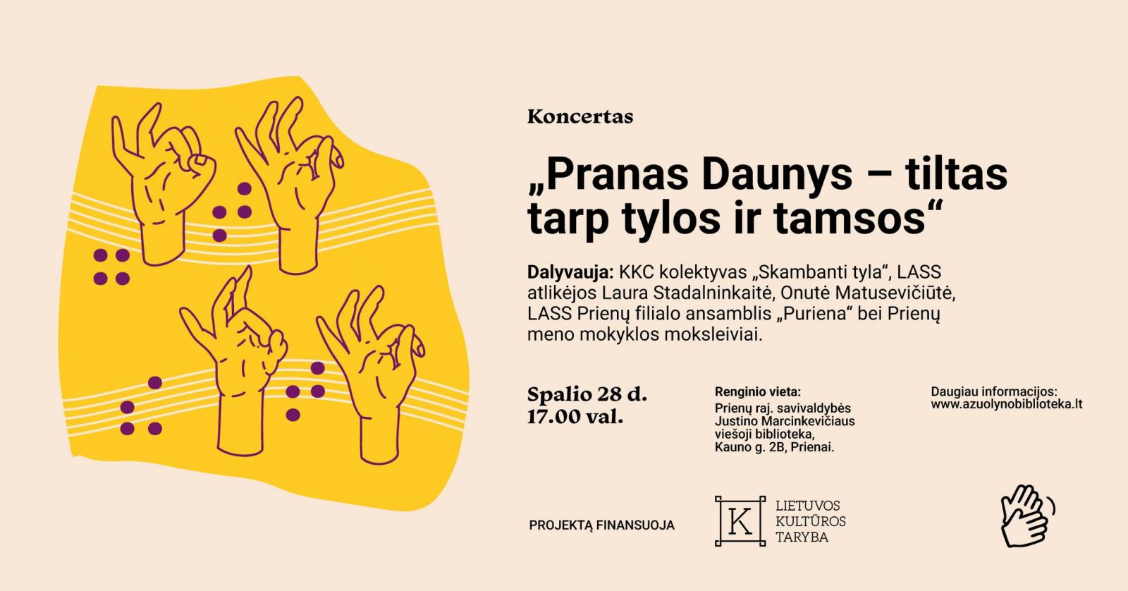 Spalio 28 d. 17.00 val. Prienų Justino Marcinkevičiaus viešojoje bibliotekoje – koncertas „Pranas Daunys – tiltas tarp tylos ir tamsos“. Minėdama 125-ąsias Brailio rašto kūrėjo, neregių ir kurčiųjų bendruomenių veiklos iniciatoriaus, muzikanto, kompozitoriaus, rašytojo, poeto, pedagogo, publicisto Prano Daunio gimimo metines, Ąžuolyno biblioteka vykdo projektą „Šviesa tamsoje, garsas tyloje“. Kviečiame į projekto renginį „Pranas Daunys – tiltas tarp tylos ir tamsos“, kuriame paskaitą apie P. Daunį ir Lietuvos neregių bei kurčiųjų bendruomenių istoriją skaitys Ąžuolyno bibliotekos Kaunistikos grupės istorikė Skaidra Grabauskienė.