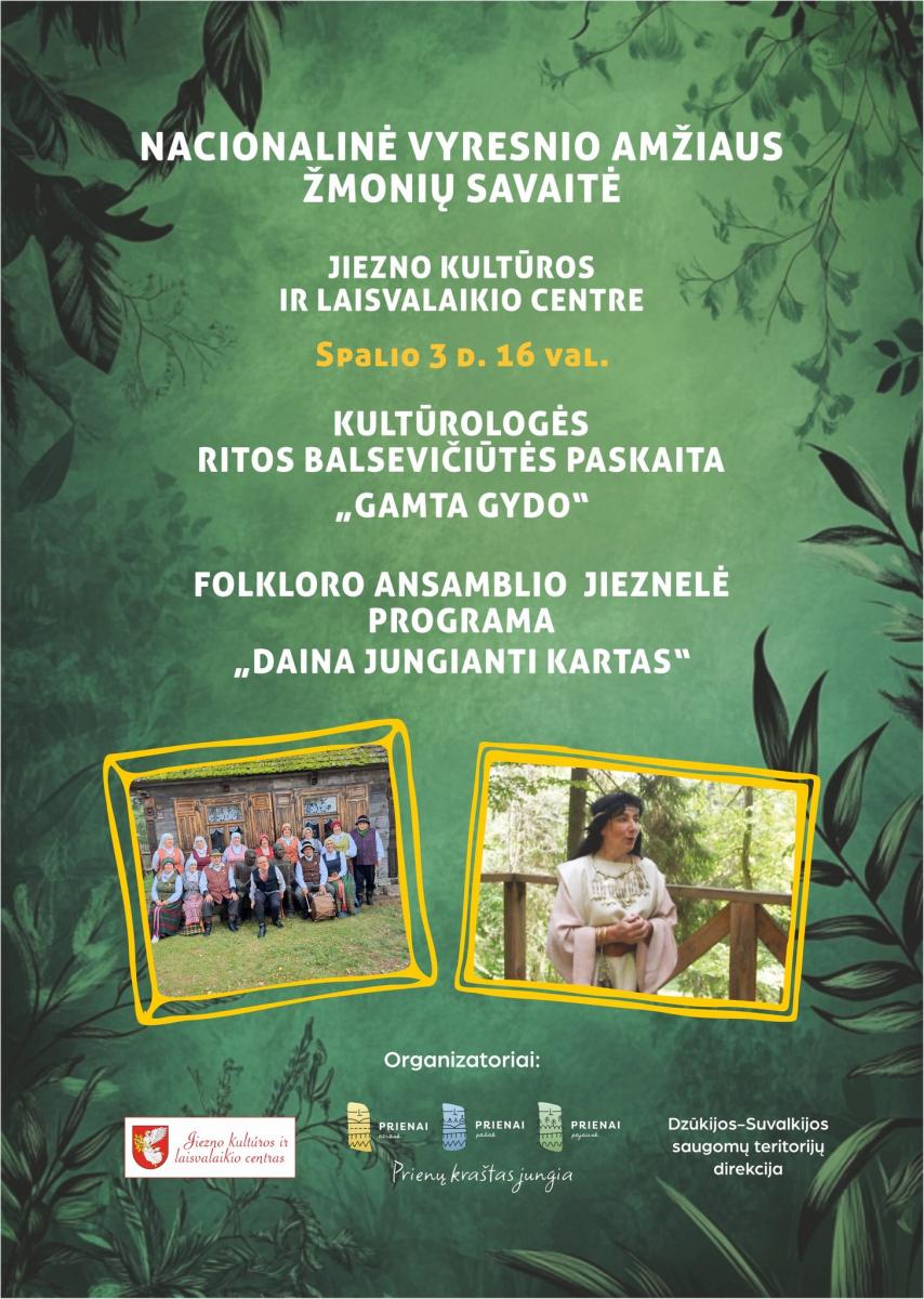 Spalio 3 d. 16.00 val. Jiezno kultūros ir laisvalaikio centre – kultūrologės Ritos Balsevičiūtės paskaita „Gamta gydo“. Folkloro ansamblio „Jieznelė“ programa „Daina jungianti kartas“. Renginys skirtas Nacionalinei vyresniojo amžiaus žmonių savaitei.