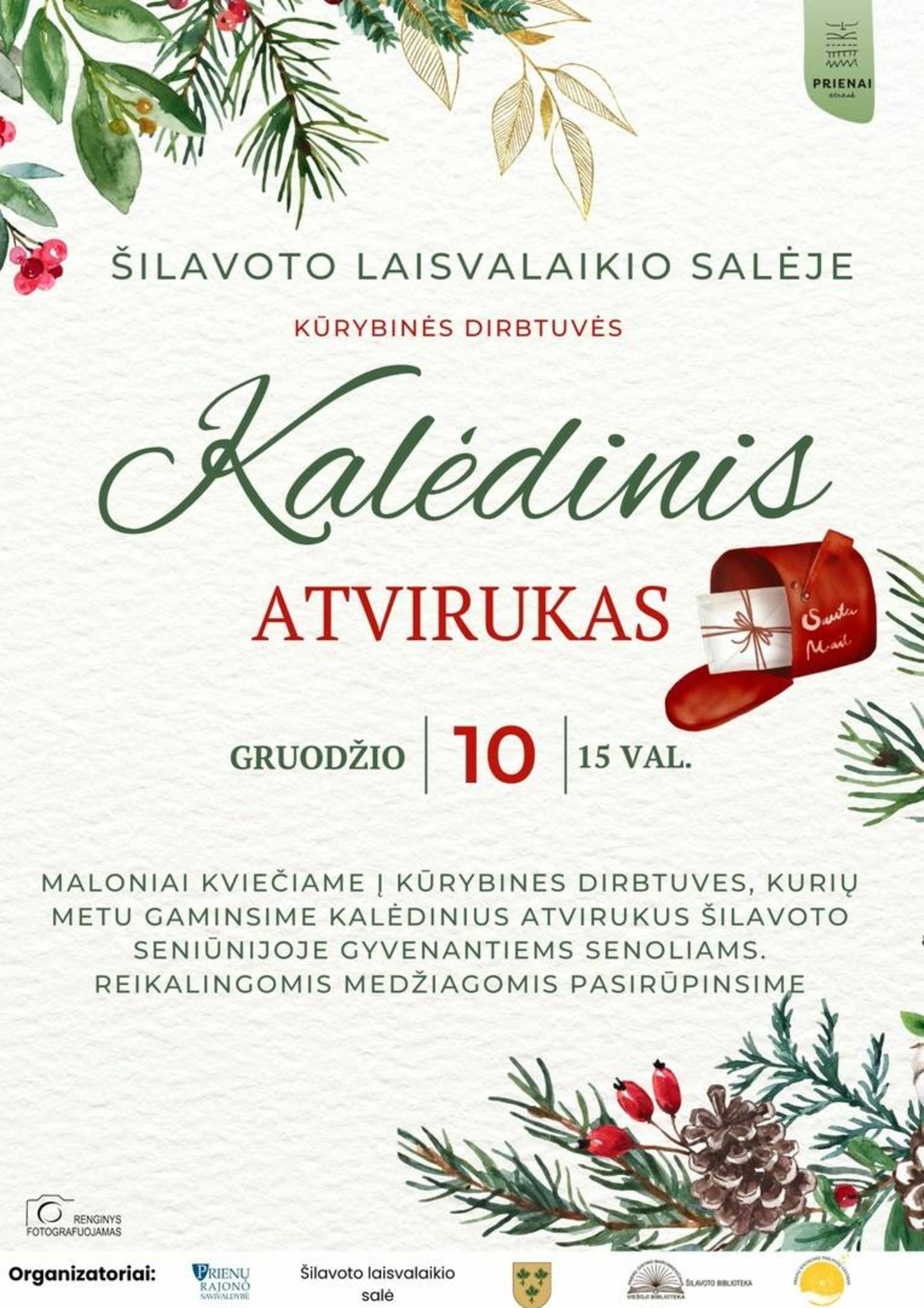 Gruodžio 10 d. 15.00 val. Šilavoto laisvalaikio salėje – kūrybinės dirbtuvės „Kalėdinis atvirukas“. Maloniai kviečiame į kūrybines dirbtuves, kurių metu gaminsime kalėdinius atvirukus Šilavoto seniūnijoje gyvenantiems senoliams. Reikalingomis medžiagomis pasirūpinsime.