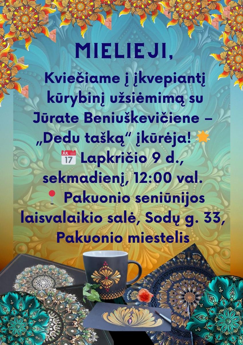 Lapkričio 9 d. 12.00 val. Pakuonio seniūnijos laisvalaikio salėje – įkvepiantis kūrybinis užsiėmimas su studijos „Dedu tašką“ įkūrėja Jūrate Beniuškevičiene. Jūratė Beniuškevičienė pristatys unikalią taškavimo techniką, papasakos jos istoriją nuo pirmųjų žingsnių iki dabar ir atskleis, kaip ji padeda moterims išlaisvinti savo kūrybinį potencialą. Sužinosite, kaip šis menas plečiasi ir keičia gyvenimus, o svarbiausia – turėsite galimybę išbandyti šią techniką praktikoje.