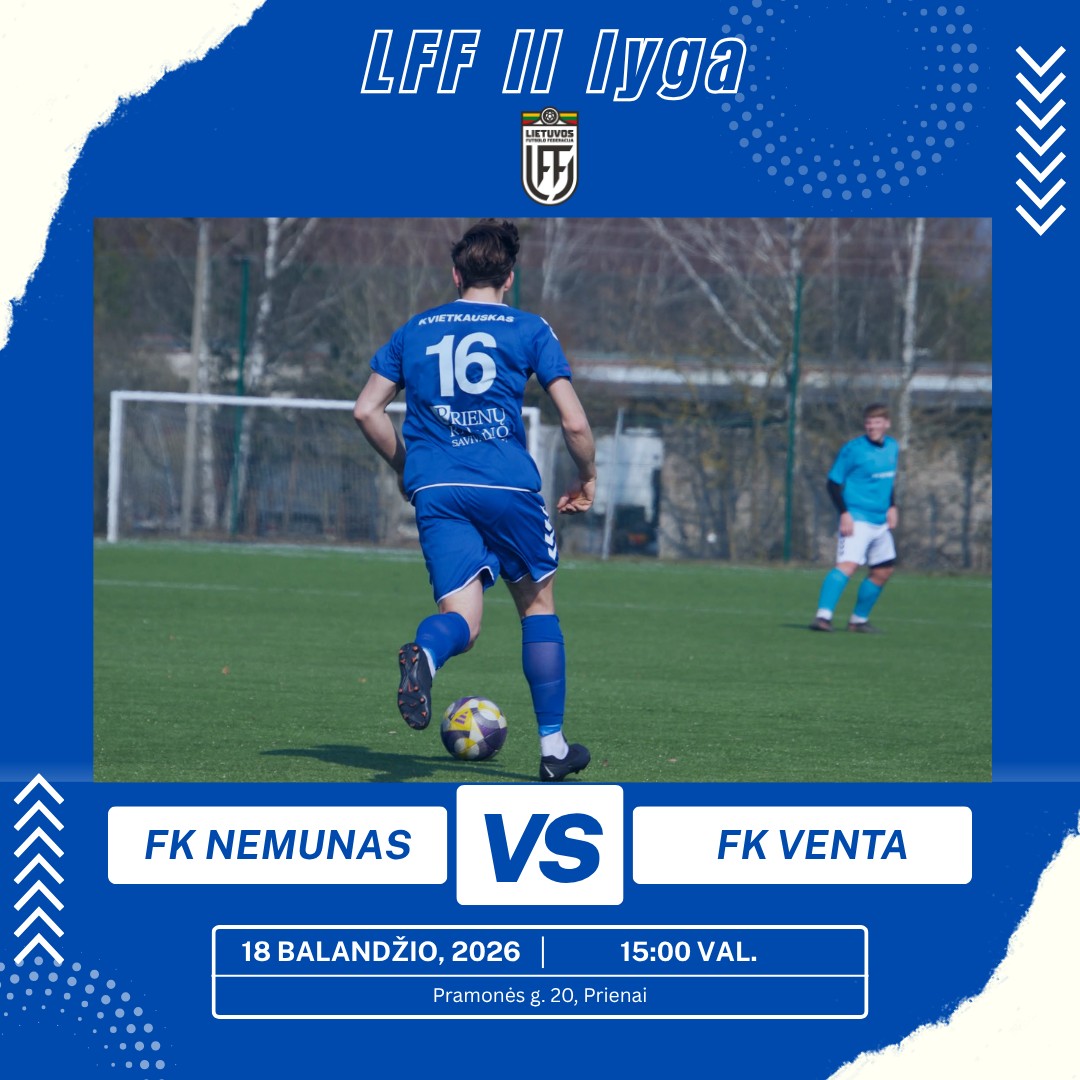 Balandžio 18 d. 15.00 val. Prienų sporto centro stadione (Pramonės g. 20, Prienai) – LFF II lygos futbolo varžybos: FK „Nemunas“ – FK „Venta“ (Kuršėnai).