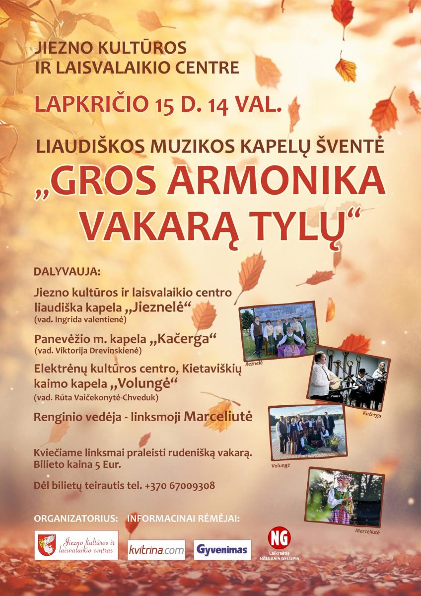 Lapkričio 15 d. 14.00 val. Jiezno kultūros ir laisvalaikio centre – liaudiškos muzikos kapelų šventė „Gros armonika vakarą tylų“. Dalyvauja: Jiezno kultūros ir laisvalaikio centro liaudiška kapela „Jieznelė“ (vad. Ingrida Valentienė), Panevėžio m. kapela „Kačerga“ (vad. Viktorija Drevinskienė), Elektrėnų kultūros centro Kietaviškių kaimo kapela „Volungė“ (vad. Rūta Vaičekonytė-Chveduk). Renginio vedėja – linksmoji Marceliutė. Kviečiame linksmai praleisti rudenišką popietę. Bilieto kaina – 5 Eur. Dėl bilietų teirautis tel. +370 670 09308.