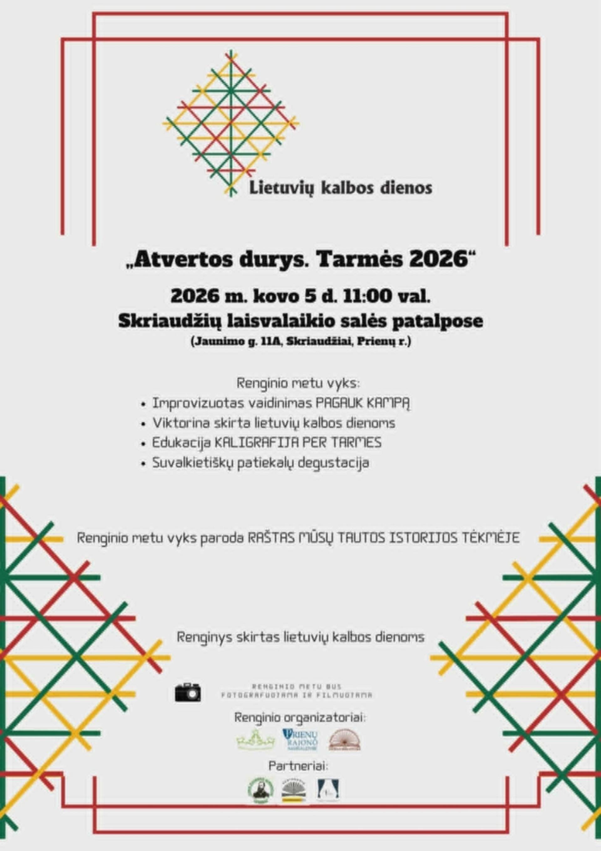Kovo 5 d. 11.00 val. Skriaudžių laisvalaikio salėje – Lietuvių kalbos dienoms skirtas renginys „Atvertos durys. Tarmės 2026“. Renginio metu vyks improvizuotas vaidinimas „Pagauk kampą“, viktorina, skirta Lietuvių kalbos dienoms, edukacija „Kaligrafija per tarmes“, suvalkietiškų patiekalų degustacija, veiks paroda „Raštas mūsų tautos istorijos tėkmėje“.