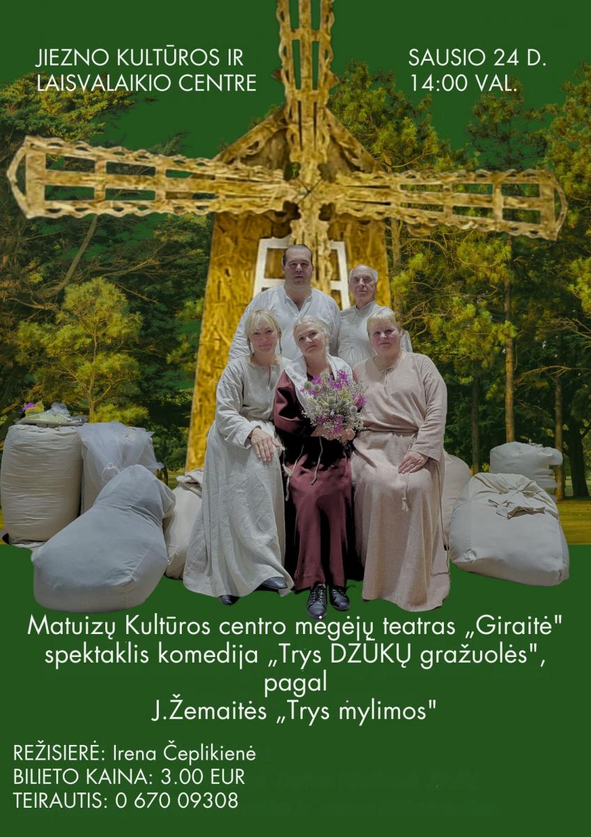 Sausio 24 d. 14.00 val. Jiezno kultūros ir laisvalaikio centre – Matuizų kultūros centro mėgėjų teatro „Giraitė“ spektaklis (komedija) „Trys dzūkų gražuolės“. Pagal J. Žemaitės komediją „Trys mylimos“. Bilieto kaina 3 Eur. Bilietų teirautis tel. +370 670 09308.