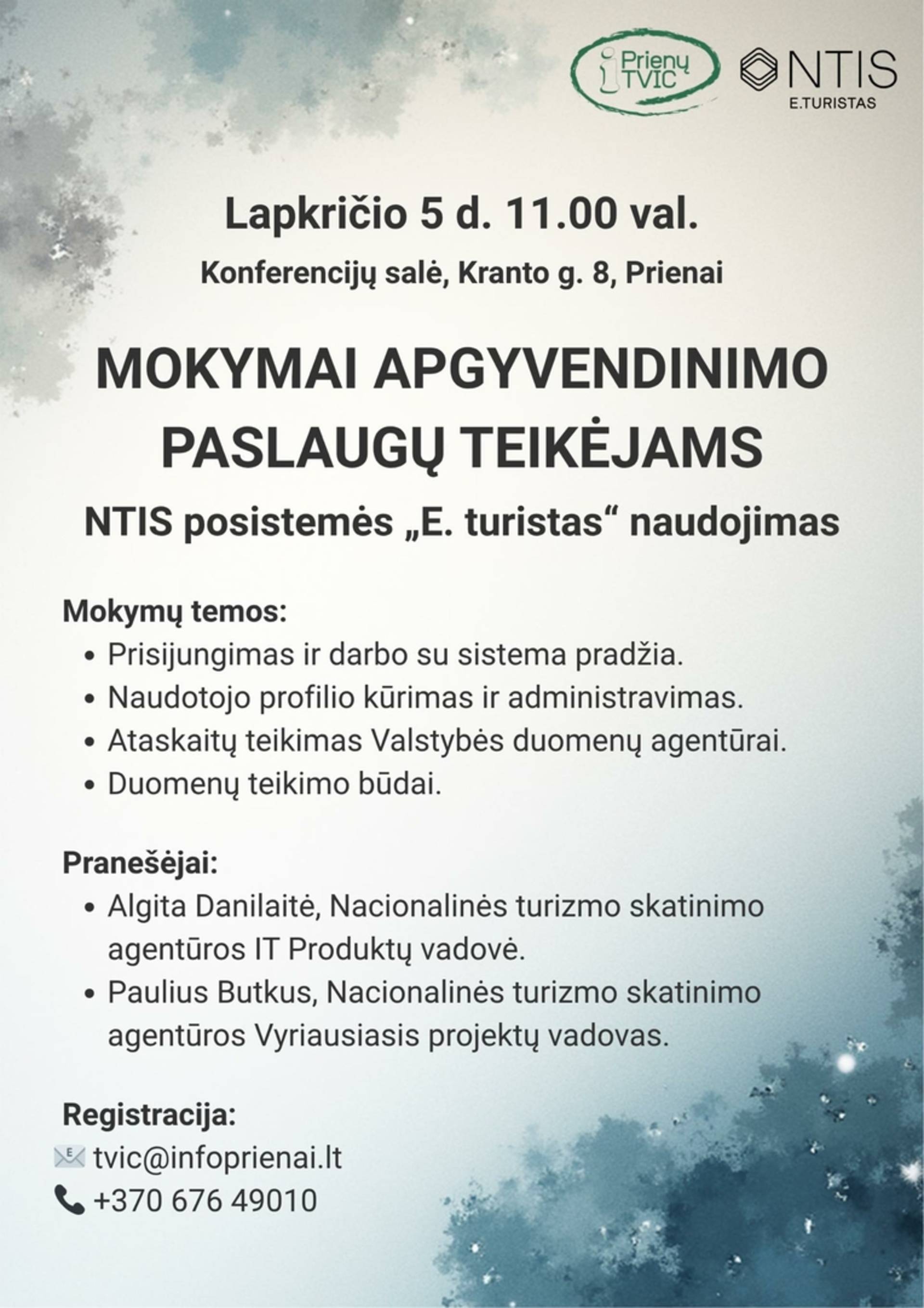 Lapkričio 5 d. 11.00 val. Prienuose, Konferencijų salėje (Kranto g. 8, Prienai) – mokymai apgyvendinimo paslaugų teikėjams. NTI posistemės „E turistas“ naudojimas.