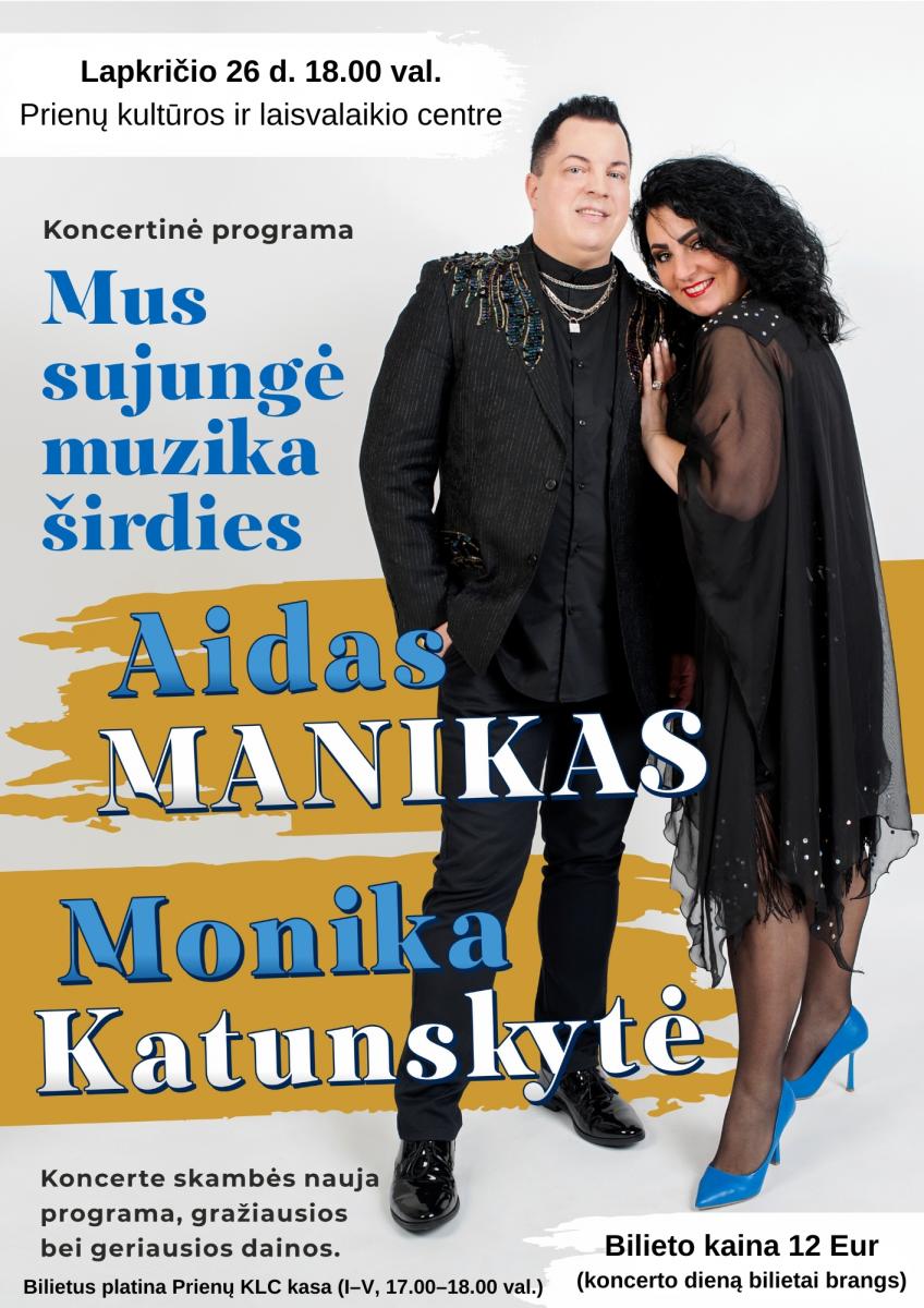 Lapkričio 26 d. 18.00 val. Prienų kultūros ir laisvalaikio centre – Monikos Katunskytės ir Aido Maniko nauja koncertinė programa „Mus sujungė muzika širdies“. Koncerte skambės naujos M. Katunskytės dainos ir žmonių mylimi šlageriai „Pražydo sodai“, „Meilė likimais žaidžia“ ir kitos dainos. Dainų kūrėjas ir atlikėjas Aidas Manikas šiemet švenčia gražų dvidešimties metų sceninės veiklos jubiliejų. Koncerte skambės naujausios ir žinomos, širdį paliečiančios Aido kūrybos dainos. Bilieto kaina – 12 Eur. Koncerto dieną bilietai brangs.