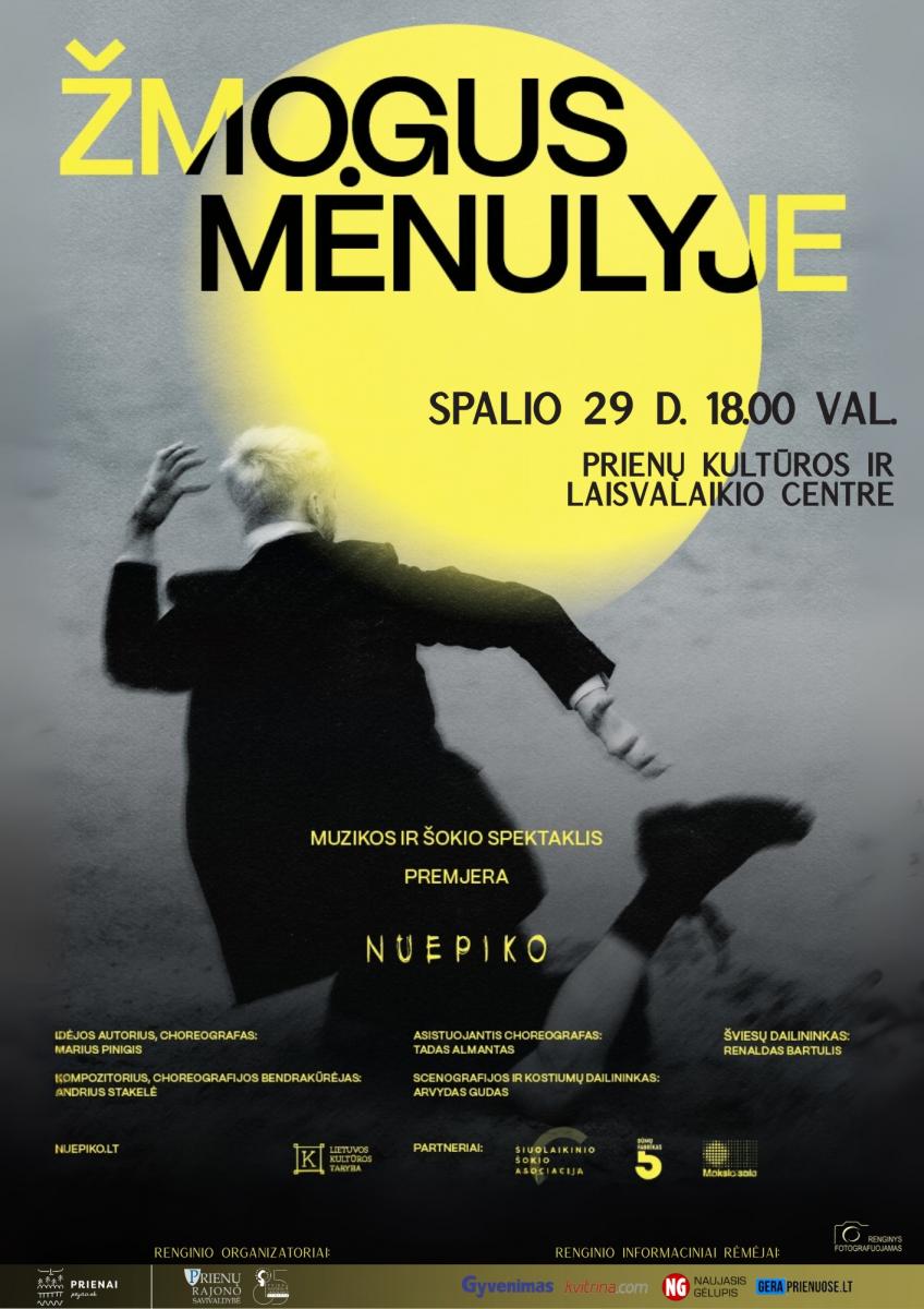 Spalio 29 d. 18.00 val. Prienų kultūros ir laisvalaikio centre – muzikos ir šokio spektaklio „Žmogus mėnulyje“ premjera. Šis spektaklis – š. m. rugpjūčio 25–29 d. Prienų kultūros ir laisvalaikio centre vykusio šiuolaikinio šokio asociacijos antrosios pakopos rezidencijos, kurioje dalyvavo Marius Pinigis ir Andrius Stakelė su visa komanda, kūrybinio darbo rezultatas.