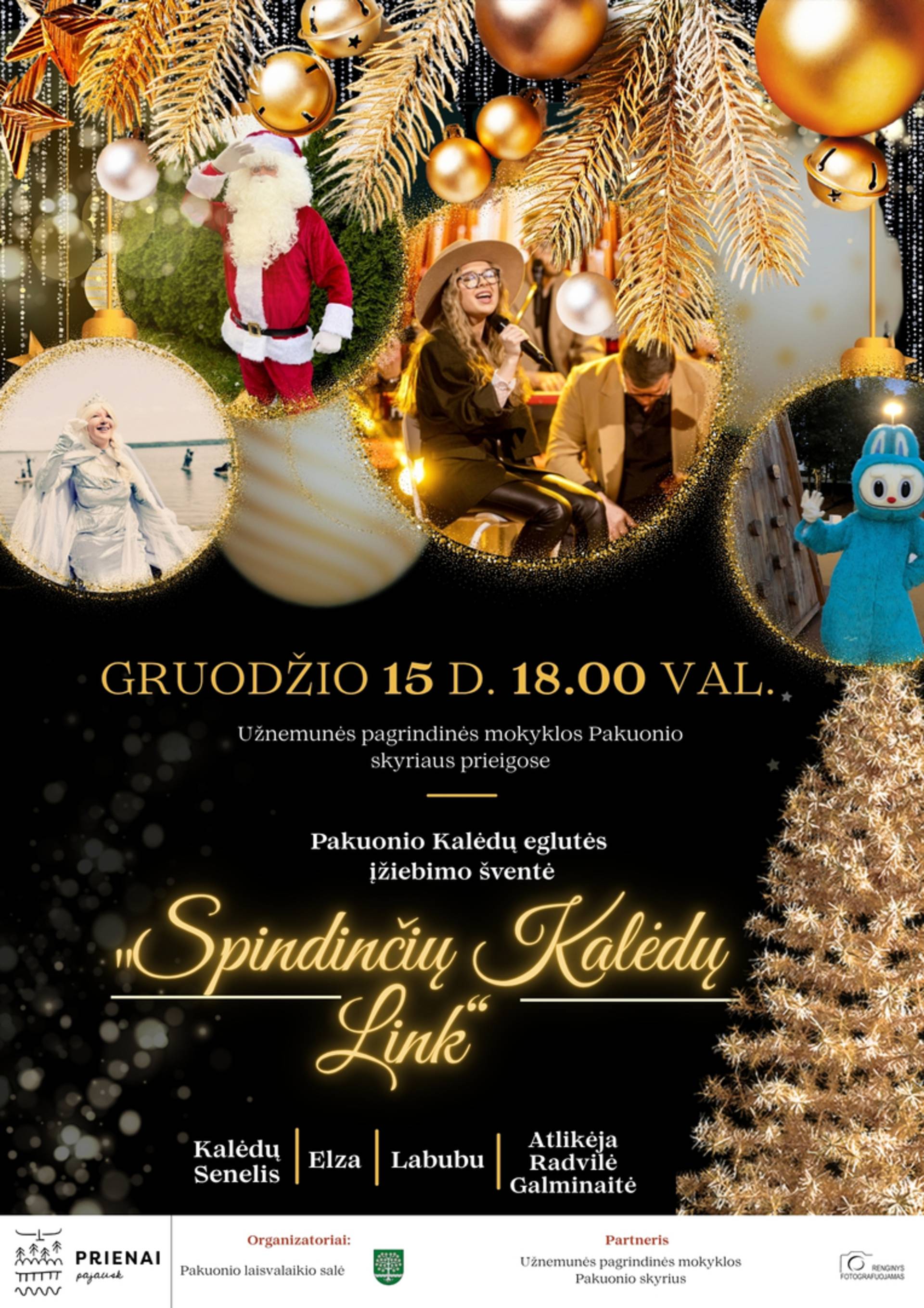 Gruodžio 15 d. 18.00 val. Užnemunės pagrindinės mokyklos Pakuonio skyriaus prieigose – Pakuonio Kalėdų eglutės įžiebimo šventė „Spindinčių Kalėdų link“. Programoje – Kalėdų Senelis, Elza, Labubu, atlikėja Radvilė Galminaitė.