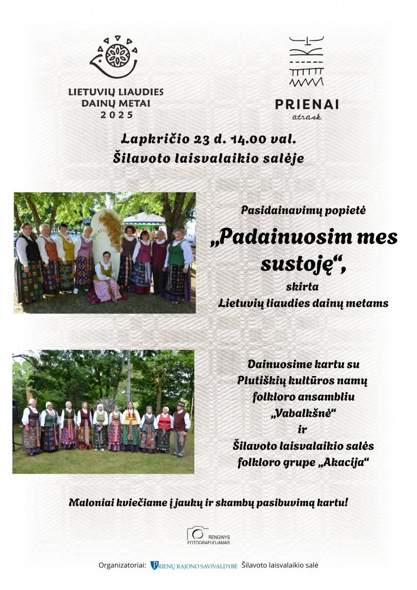 Lapkričio 23 d. 14.00 val. Šilavoto laisvalaikio salėje – pasidainavimų popietė „Padainuosim mes sustoję“, skirta Lietuvių liaudies dainų metams. Dainuosime kartu su Plutiškių kultūros namų folkloro ansambliu „Vabalkšnė“ ir Šilavoto laisvalaikio salės folkloro grupe „Akacija“. Maloniai kviečiame į jaukų ir skambų pasibuvimą kartu.