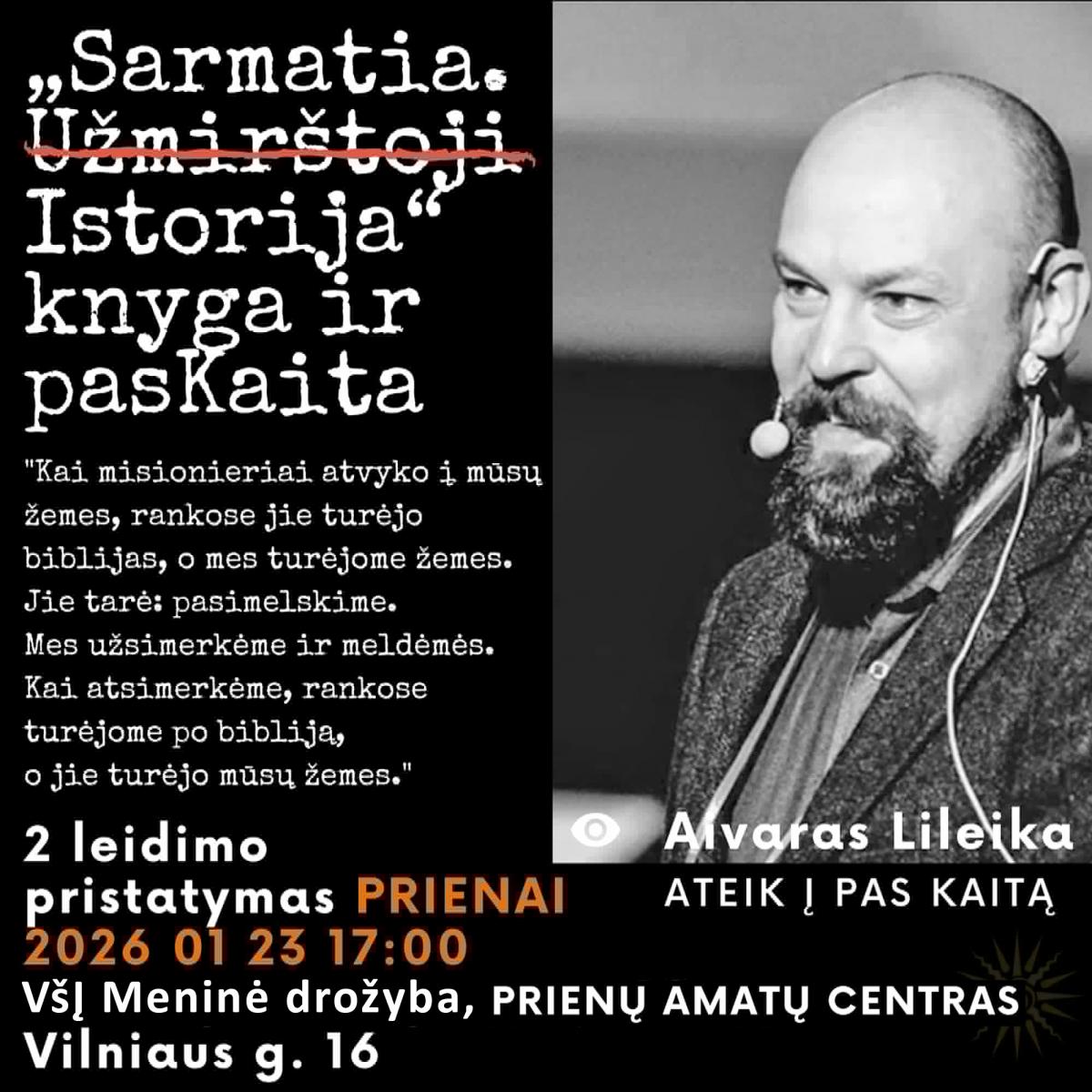 Sausio 23 d. 17.00 val. Prienų amatų centre (VšĮ „Meninė drožyba, Vilniaus g. 16, Prienai) – paskaita „Sarmatia. Užmirštoji istorija“ ir knygos 2-ojo leidimo pristatymas su Aivaru Lileika. Aivaras Lileika – nepriklausomas istorikas, ilgametis London Metropolitan University dėstytojas. Tai paskaita tiems, kurie nori suprasti giliau, net jei kai kurios mintys nustebins, šokiruos ar privers suabejoti įprastais pasakojimais.