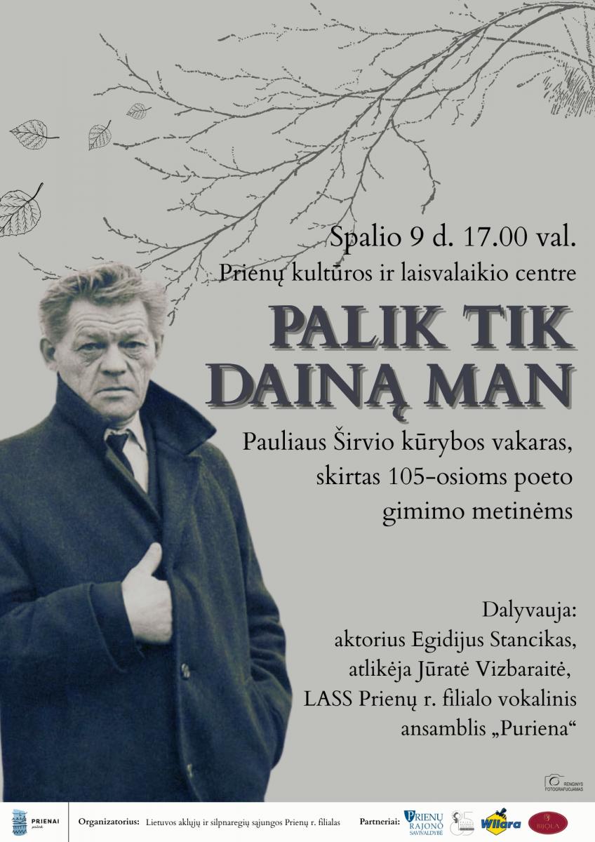 Spalio 9 d. 17.00 val. Prienų kultūros ir laisvalaikio centre – Pauliaus Širvio kūrybos vakaras „Palik tik dainą man“, skirtas poeto 105-osioms gimimo metinėms. Dalyvauja: aktorius Egidijus Stancikas, atlikėja Jūratė Vizbaraitė, LASS Prienų r. filialo vokalinis ansamblis „Puriena“.