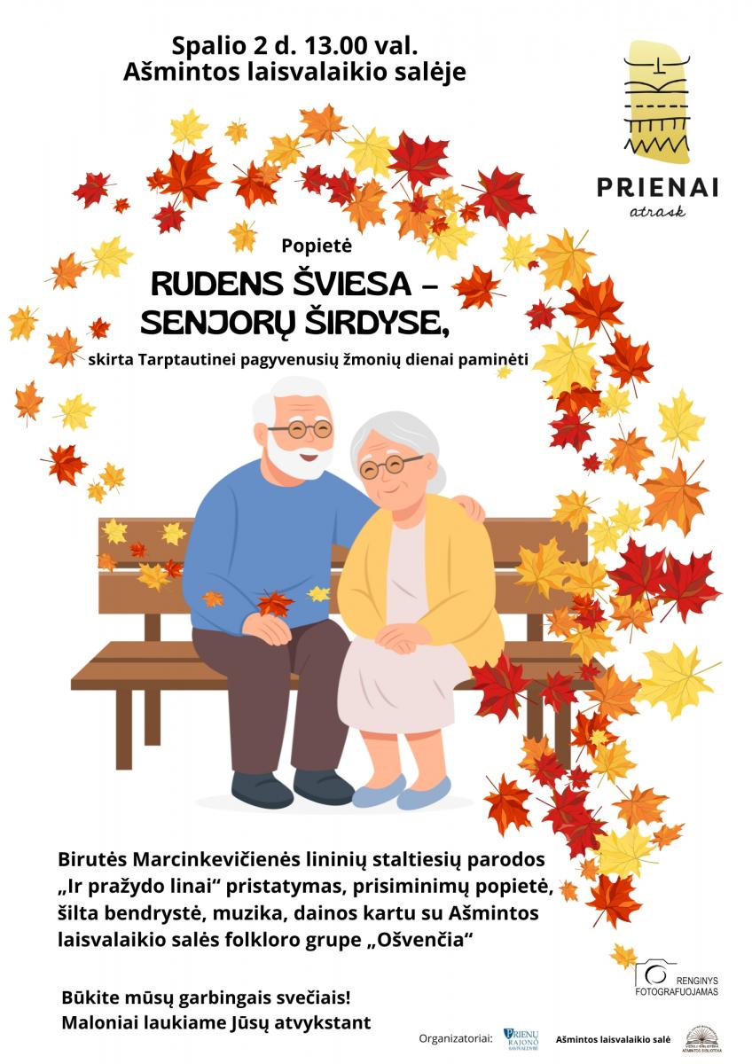 Spalio 2 d. 13.00 val Ašmintos laisvalaikio salėje – popietė „Rudens šviesa – senjorų širdyse“, skirta Tarptautinei pagyvenusių žmonių dienai paminėti. Birutės Marcinkevičienės lininių staltiesių parodos „Ir pražydo linai“ pristatymas, prisiminimų popietė, šilta bendrystė, muzika, dainos kartu su Ašmintos laisvalaikio salės folkloro grupe „Ošvenčia“.