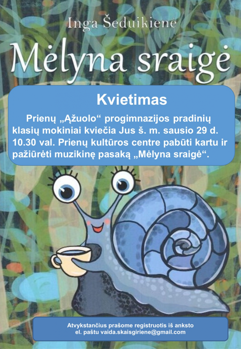 Sausio 29 d. 10.30 val. Prienų kultūros ir laisvalaikio centre – Prienų „Ažuolo“ progimnazijos pradinių klasių mokinių muzikinė pasaka „Mėlyna sraigė“. Kviečiame pabūti kartu ir pažiūrėti muzikinę pasaką.