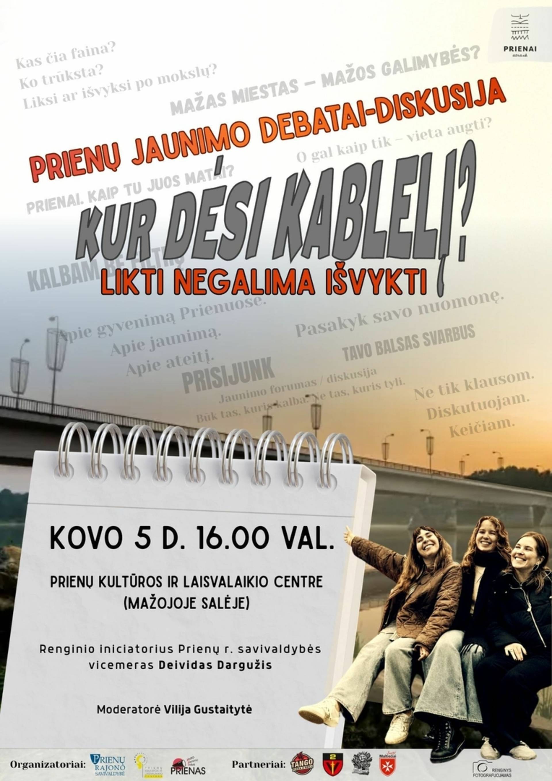 Kovo 5 d. 16.00 val. Prienų kultūros ir laisvalaikio centre (mažojoje salėje) – Prienų jaunimo debatai-diskusija „Kur dėsi kablelį? LIKTI NEGALIMA IŠVYKTI“. Renginio iniciatorius Prienų r. sav. vicemeras Deividas Dargužis. Moderatorė Vilija Gustaitytė. Kviečiame jaunimą į debatus-diskusiją.