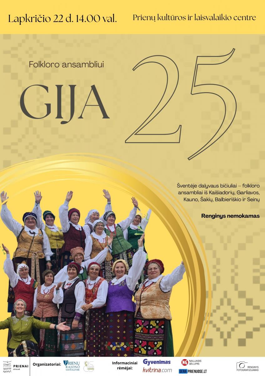 Lapkričio 22 d. 14.00 val. Prienų kultūros ir laisvalaikio centre – Prienų kultūros ir laisvalaikio centro folkloro ansamblio „Gija“ (vad. Dalė Zagurskienė) 25-mečio šventė. Šventėje dalyvaus bičiuliai – folkloro ansambliai iš Kaišiadorių, Garliavos, Kauno, Šakių, Balbieriškio ir Seinų. Renginys nemokamas.