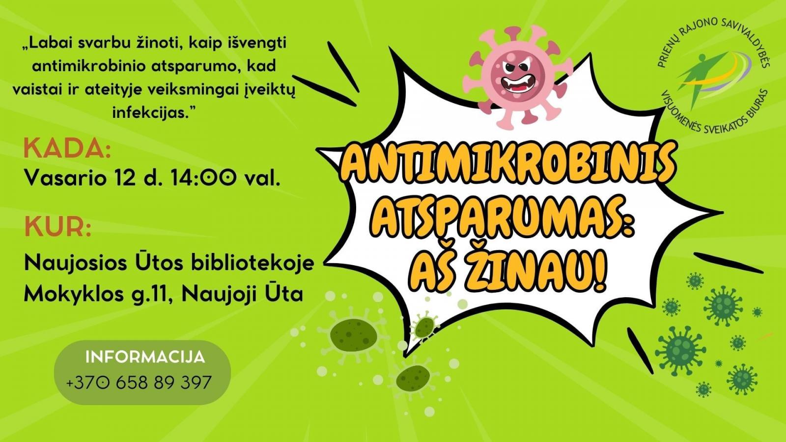 Vasario 12 d. 14.00 val. Naujosios Ūtos bibliotekoje – protmūšis bendruomenei „Antimikrobinis atsparumas: aš žinau“. Informacija tel. +370 658 89397.