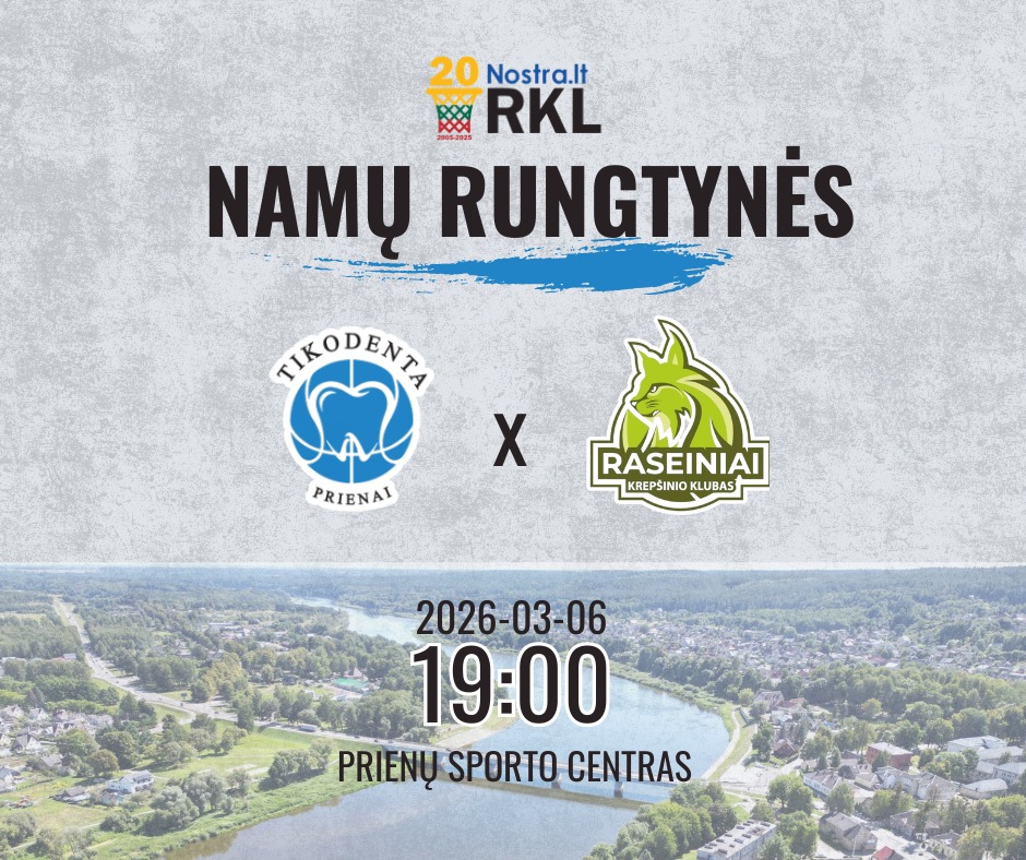 Kovo 6 d. 19.00 val. Prienų sporto arenoje – Regionų krepšinio lygos A diviziono varžybos: Prienų „Tikodenta“ – Raseinių ,,Raseiniai“.