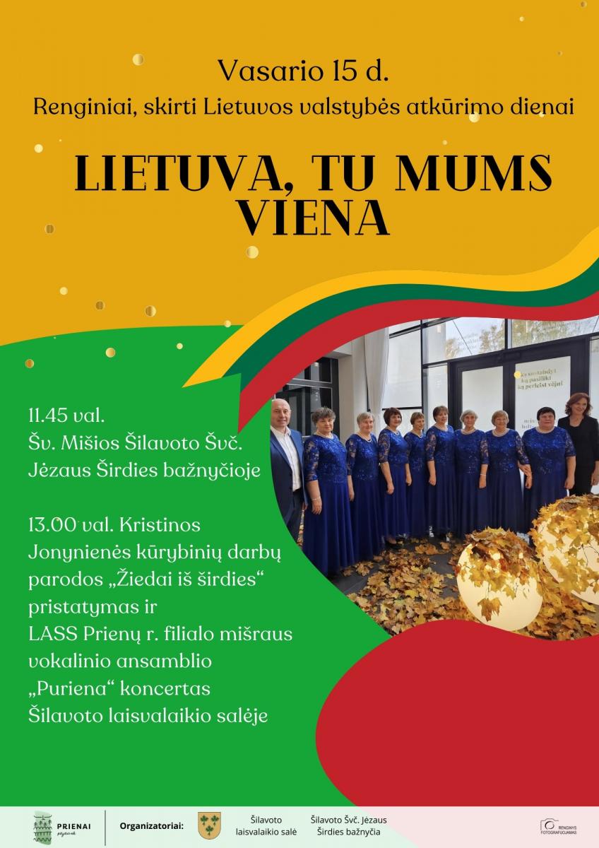 13.00 val. Kristinos Jonynienės kūrybinių darbų parodos „Žiedai iš širdies“ pristatymas ir LASS Prienų r. filialo mišraus vokalinio ansamblio „Puriena“ koncertas Šilavoto laisvalaikio salėje.