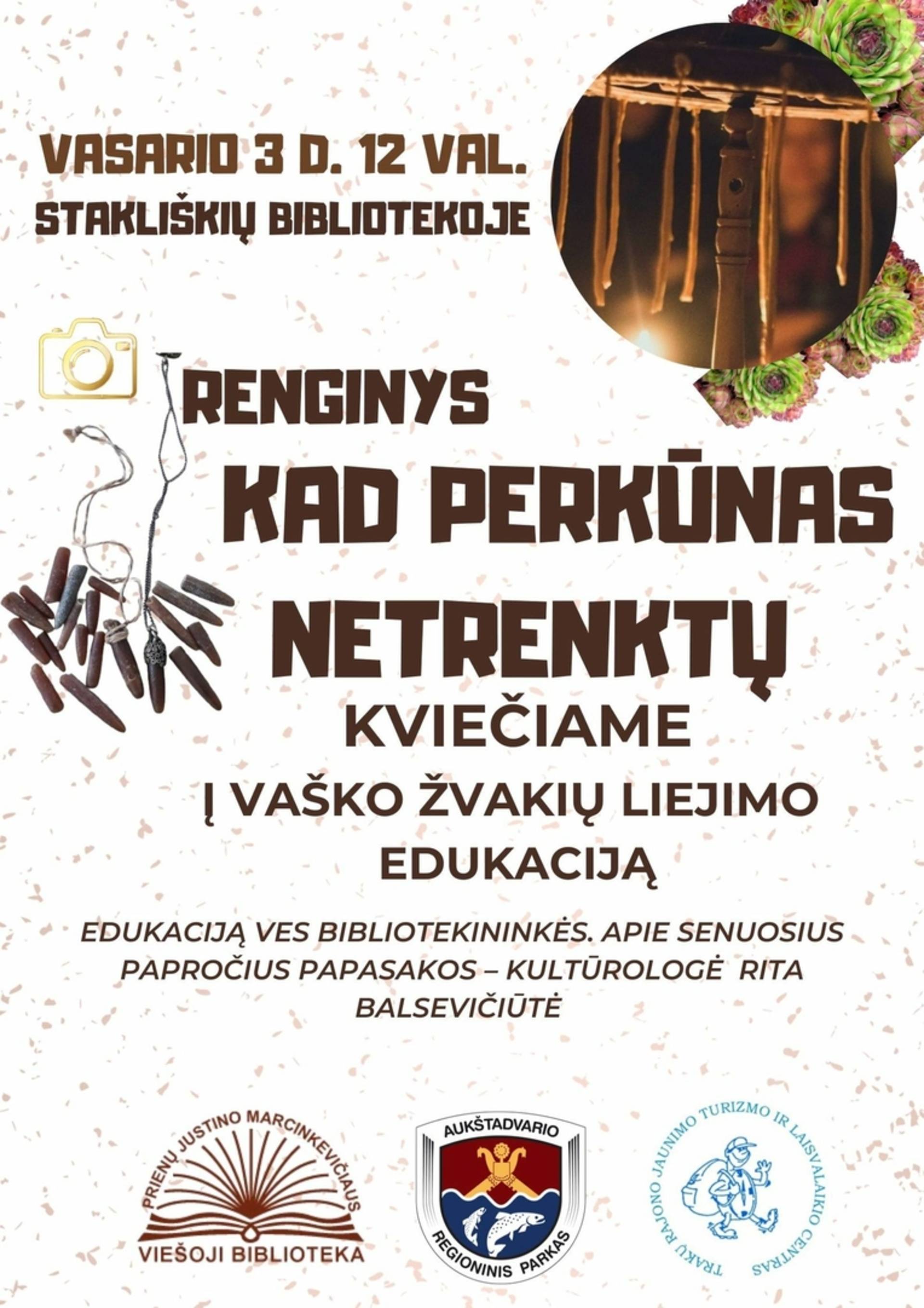 Vasario 3 d. 12.00 val. Stakliškių bibliotekoje – renginys „Kad perkūnas netrenktų“. Kviečiame į žvakių liejimo edukaciją. Edukaciją ves bibliotekininkės, apie senuosius papročius papasakos kultūrologė Rita Balsevičiūtė.