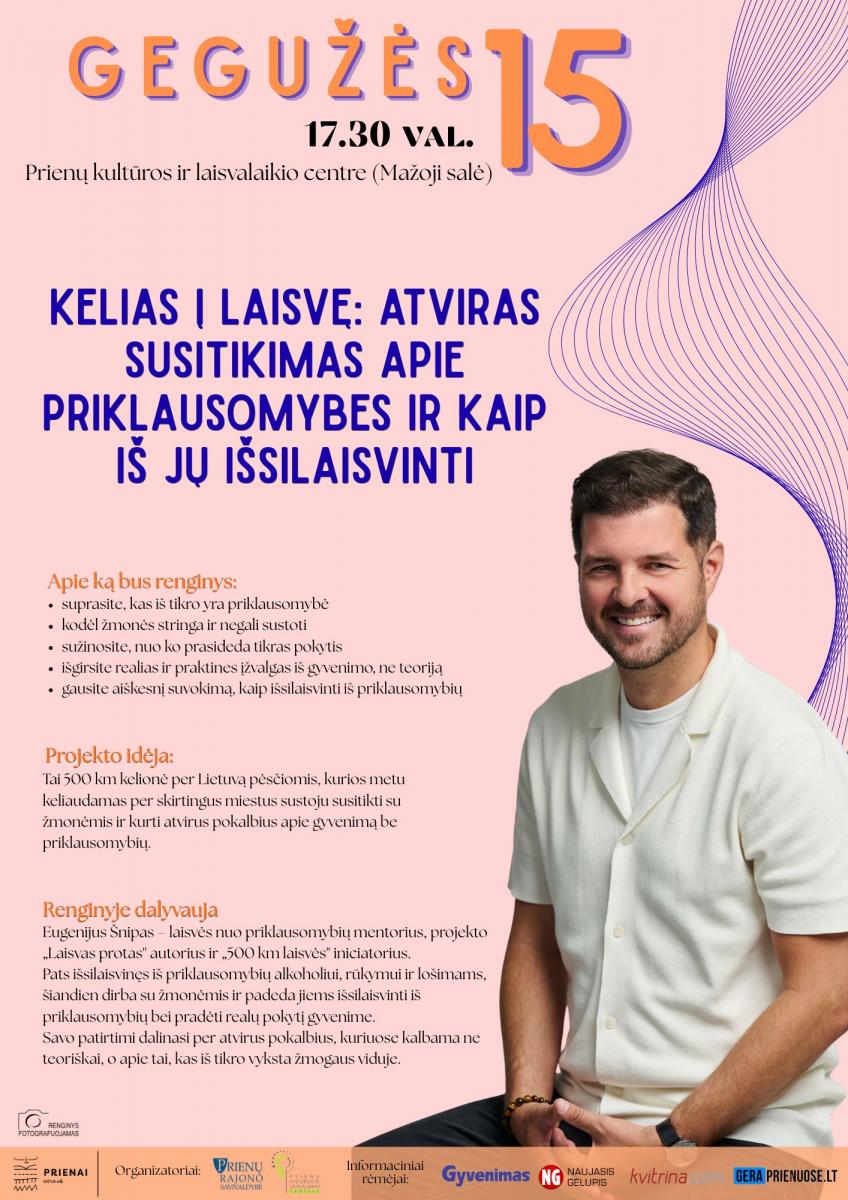 Gegužės 15 d. 17.30 val. Prienų kultūros ir laisvalaikio centro mažojoje salėje (I aukšte) – renginys „Kelias į laisvę: atviras susitikimas apie priklausomybes ir kaip iš jų išsilaisvinti“. Dalyvaus Eugenijus Šnipas – laisvės nuo priklausomybių mentorius, projekto „Laisvas protas” autorius ir „500 km laisvės” iniciatorius. Pats išsilaisvinęs iš priklausomybių alkoholiui, rūkymui ir lošimams, šiandien dirba su žmonėmis ir padeda jiems išsilaisvinti iš priklausomybių bei pradėti realų pokytį gyvenime.