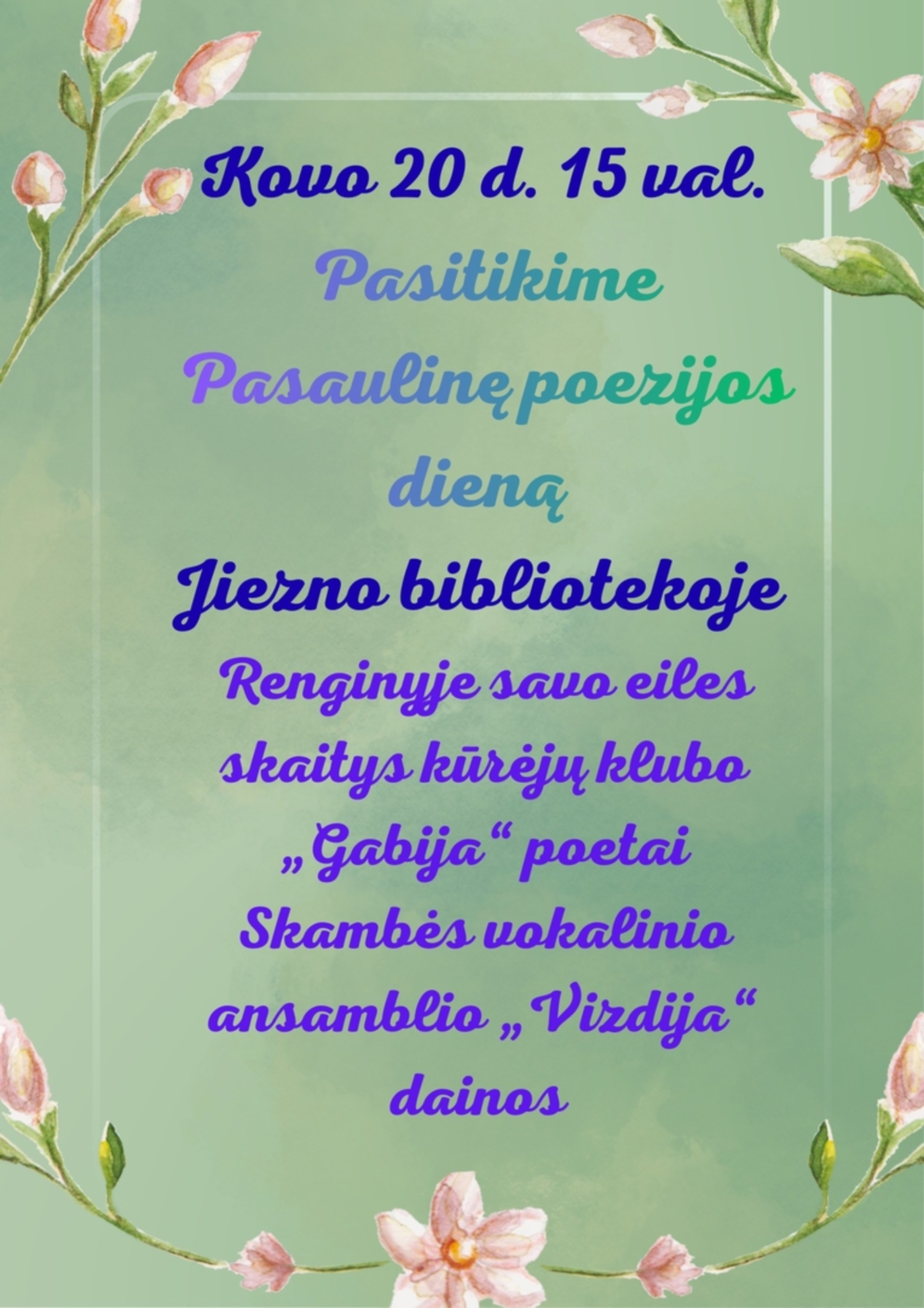 Kovo 20 d. 15.00 val. Jiezno bibliotekoje – renginys, skirtas Pasaulinei poezijos dienai. Savo eiles skaitys kūrėjų klubo „Gabija“ poetai, skambės vokalinio ansamblio „Vizdija“ dainos.