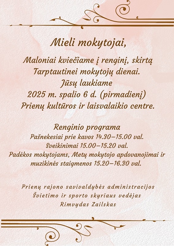 Spalio 6 d. Prienų kultūros ir laisvalaikio centre – renginys, skirtas Tarptautinei mokytojų dienai.