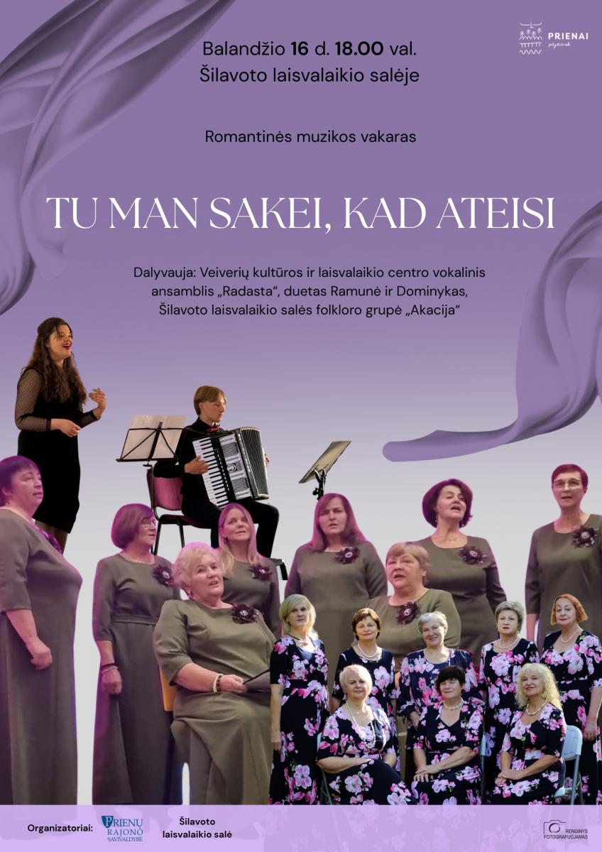 Balandžio 16 d. 18.00 val. Šilavoto laisvalaikio salėje – Romantinės muzikos vakaras „Tu man sakei, kad ateisi“. Dalyvauja Veiverių kultūros ir laisvalaikio centro vokalinis ansamblis „Radasta“, duetas Ramunė ir Dominykas, Šilavoto laisvalaikio salės folkloro grupė „Akacija“. Maloniai kviečiame vakarą praleisti su muzika. Renginys nemokamas.