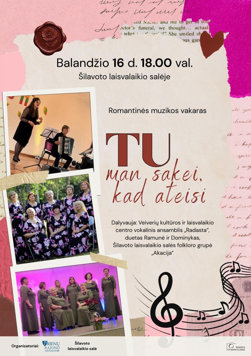 Balandžio 16 d. 18.00 val. Šilavoto laisvalaikio salėje – Romantinės muzikos vakaras „Tu man sakei, kad ateisi“. Dalyvauja Veiverių kultūros ir laisvalaikio centro vokalinis ansamblis „Radasta“, duetas Ramunė ir Dominykas, Šilavoto laisvalaikio salės folkloro grupė „Akacija“. Maloniai kviečiame vakarą praleisti su muzika. Renginys nemokamas.