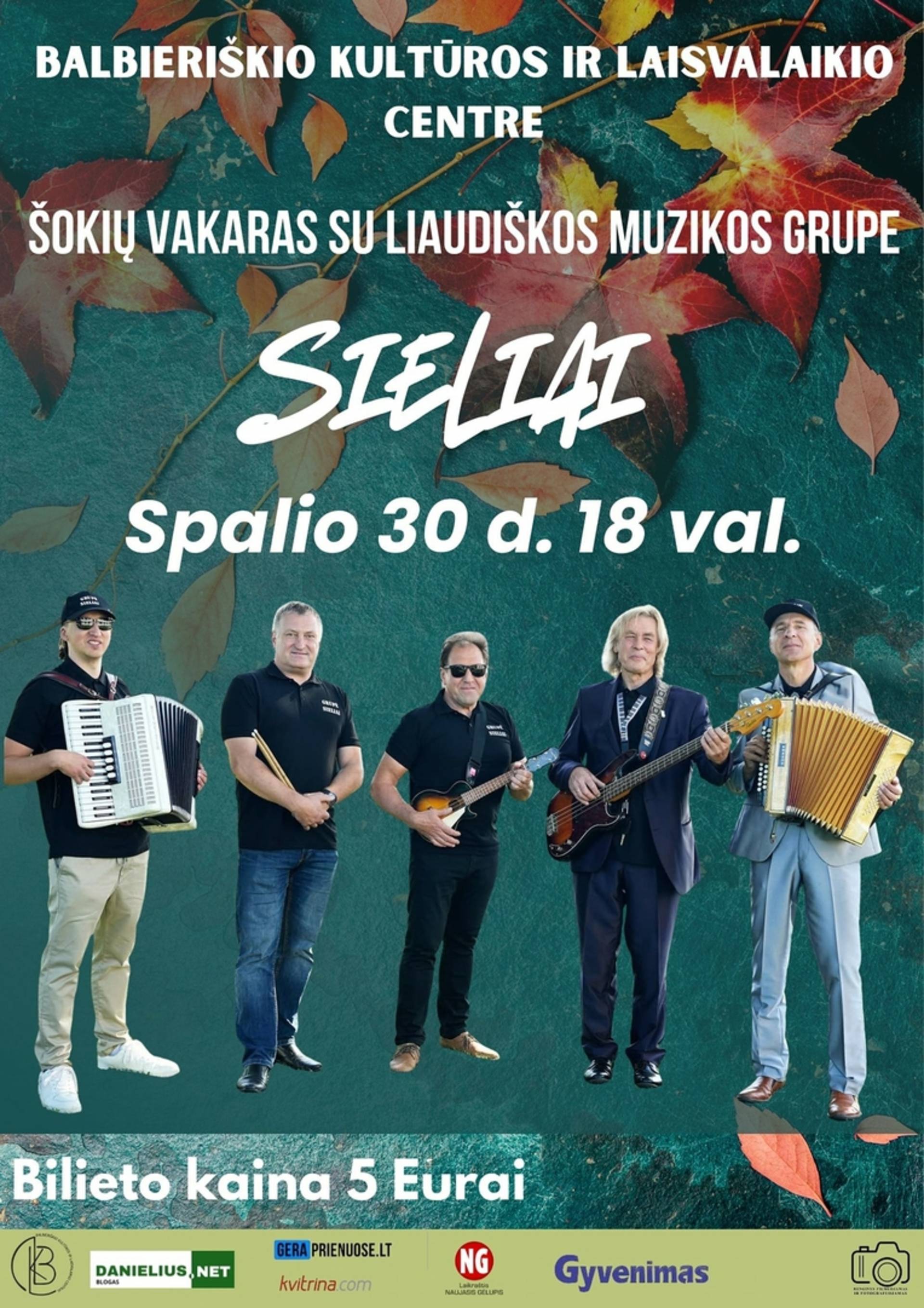 Spalio 30 d. 18.00 val. Balbieriškio kultūros ir laisvalaikio centre – šokių vakaras su liaudiškos muzikos grupe „Sieliai“. Puiki muzika ir gera nuotaika – viskas, ko reikia smagiam rudens vakarui. Bilieto kaina – 5 Eur.
