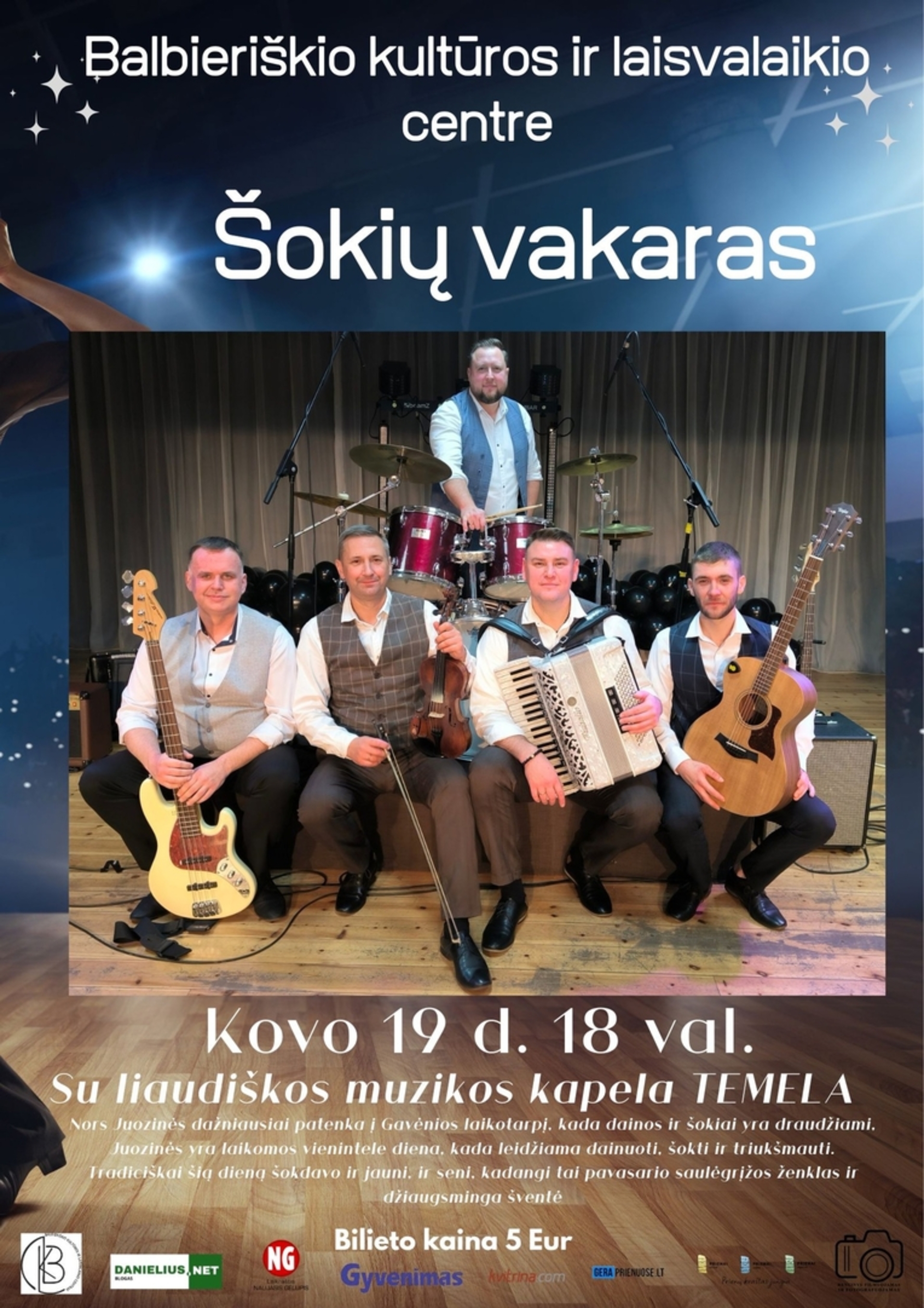Kovo 19 d. 18.00 val. Balbieriškio kultūros ir laisvalaikio centre – šokių vakaras su liaudiškos muzikos kapela „Temela“. Laukia gyva muzika, smagios melodijos ir puiki proga pašokti ir pabūti kartu. Bilieto kaina – 5 Eur.