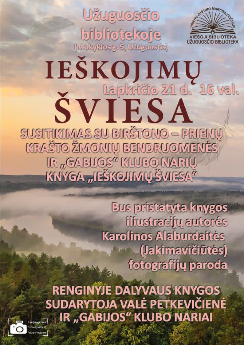 Lapkričio 21 d. 16.00 val. Užuguosčio bibliotekoje – susitikimas su Birštono – Prienų krašto žmonių bendruomenės ir „Gabijos“ klubo narių knyga „Ieškojimų šviesa“. Bus pristatyta knygos iliustracijų autorės Karolinos Alaburdaitės (Jakimavičiūtės) fotografijų paroda. Renginyje dalyvaus knygos sudarytoja Valė Petkevičienė ir „Gabijos“ klubo nariai.