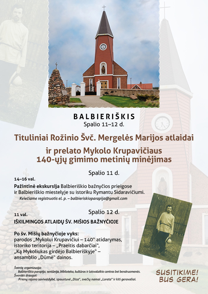 Spalio 11–12 dienomis Balbieriškyje – Tituliniai Rožinio Švč. Mergelės Marijos atlaidai ir prelato Mykolo Krupavičiaus 140-ųjų gimimo metinių minėjimas.