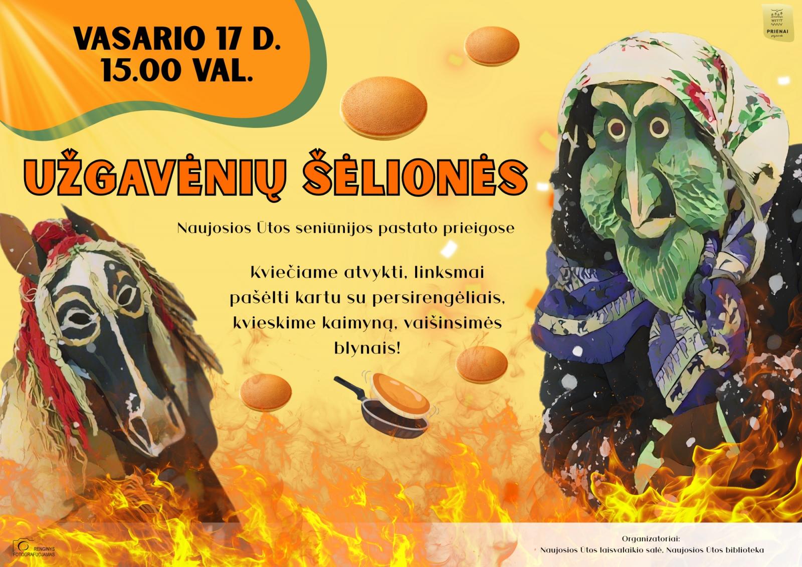 Vasario 17 d. 15.00 val. Naujosios Ūtos seniūnijos pastato prieigose – Užgavėnių šventė „Užgavėnių šelionės“. Kviečiame atvykti, linksmai pašėlti kartu su persirengėliais, kvieskime kaimyną, vaišinsimės blynais.