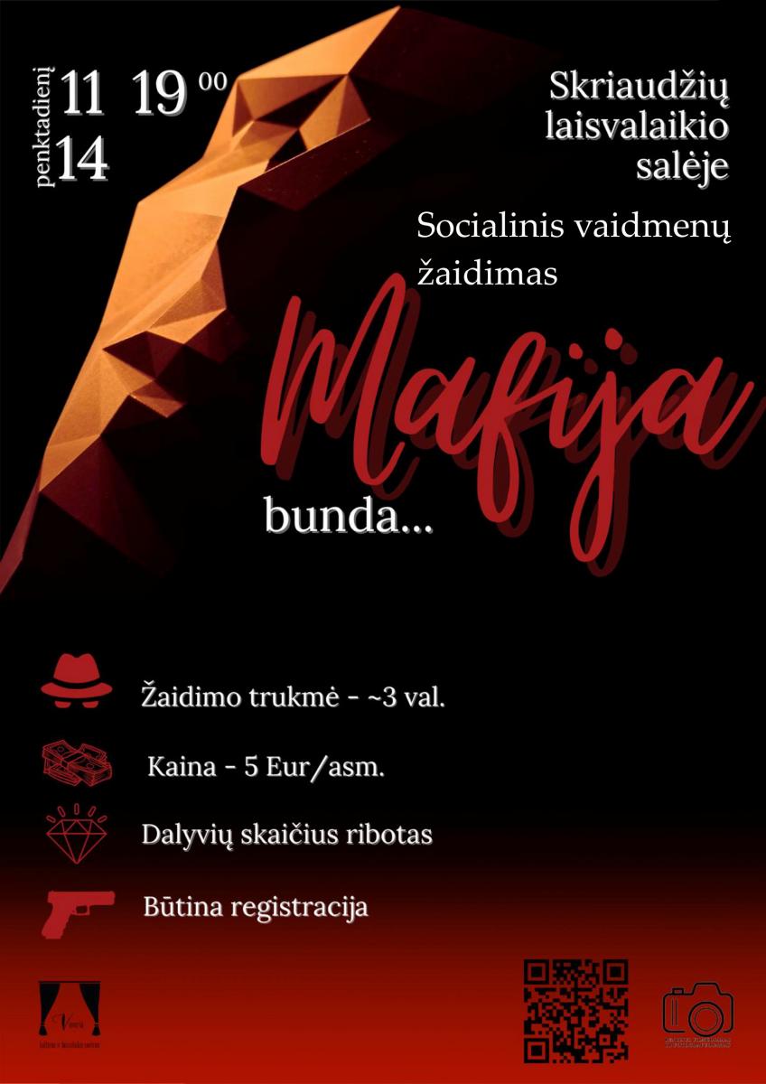 Lapkričio 14 d. 19.00 val. Skriaudžių laisvalaikio salėje – vaidmenų žaidimas „Mafija bunda…“. Tai socialinis vaidmenų žaidimas, kuriame žaidėjai atlieka skirtingus vaidmenis ir bando įveikti priešingą komandą per diskusijas, argumentavimą ir blefavimą.