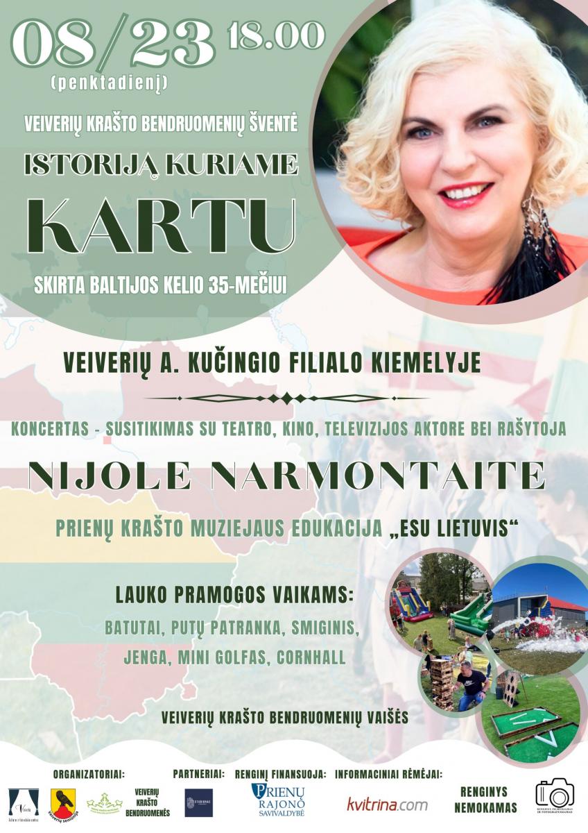 Rugpjūčio 23 d. 18.00 val. Veiverių A. Kučingio filialo kiemelyje – Veiverių krašto bendruomenių šventė „Istoriją kuriame kartu“, skirta Baltijos kelio 35-mečiui. Koncertas-susitikimas su teatro, televizijos ir kino aktore, rašytoja Nijole Narmontaite. Prienų krašto muziejaus edukaciia „Esu lietuvis“. Lauko pramogos vaikams, Veiverių krašto bendruomenių vaišės.
