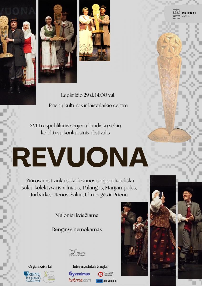 Lapkričio 29 d. 14.00 val. Prienų kultūros ir laisvalaikio centre – XVIII respublikinis senjorų liaudiškų šokių kolektyvų konkursinis festivalis „Revuona“. Žiūrovams trankų šokį dovanos senjorų liaudiškų šokių kolektyvai iš Vilniaus, Palangos, Marijampolės, Jurbarko, Utenos, Šakių, Ukmergės ir Prienų. Renginys nemokamas.