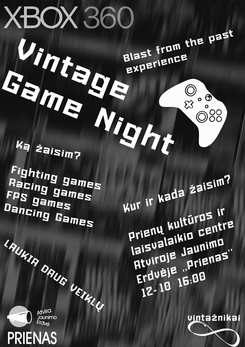 Gruodžio 10 d. 16.00 val. atviroje jaunimo erdvėje „Prienas“ (Prienų kultūros ir laisvalaikio centre) – žaidimų vakaras jaunimui. Jaunimo muzikos grupė „Vintažnikai“ kviečia jaunimą į nepamirštamą, azartišką, energingą žaidimų vakarą su XBOX. Laukiame tavęs su draugais.