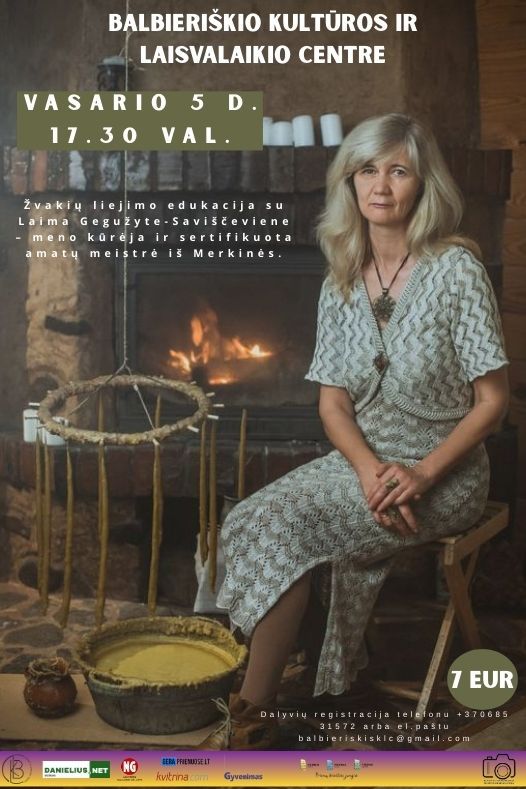 Vasario 5 d. 17.30 val. Balbieriškio kultūros ir laisvalaikio centre – žvakių liejimo edukacija su Laima Gegužyte-Saviščevičiene – meno kūrėja ir sertifikuota amatų meistre iš Merkinės. Sužinosite apie tradicinį žvakių liejimo procesą ir patys pasigaminsite savo žvakę. Kaina – 7 Eur. Registracija tel. +370 685 31572, el. paštu [email protected]
